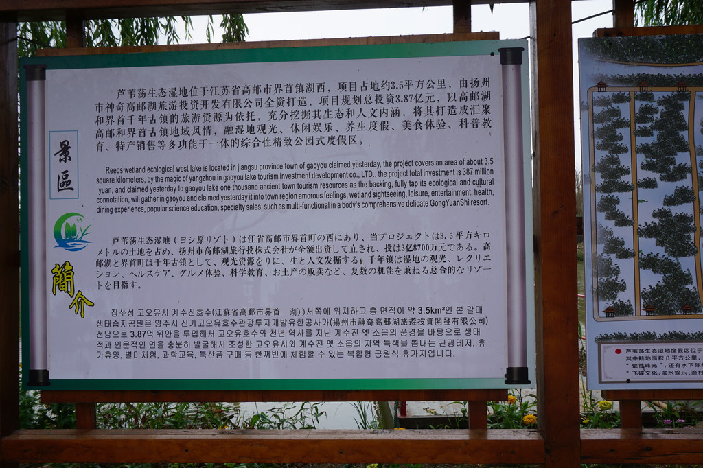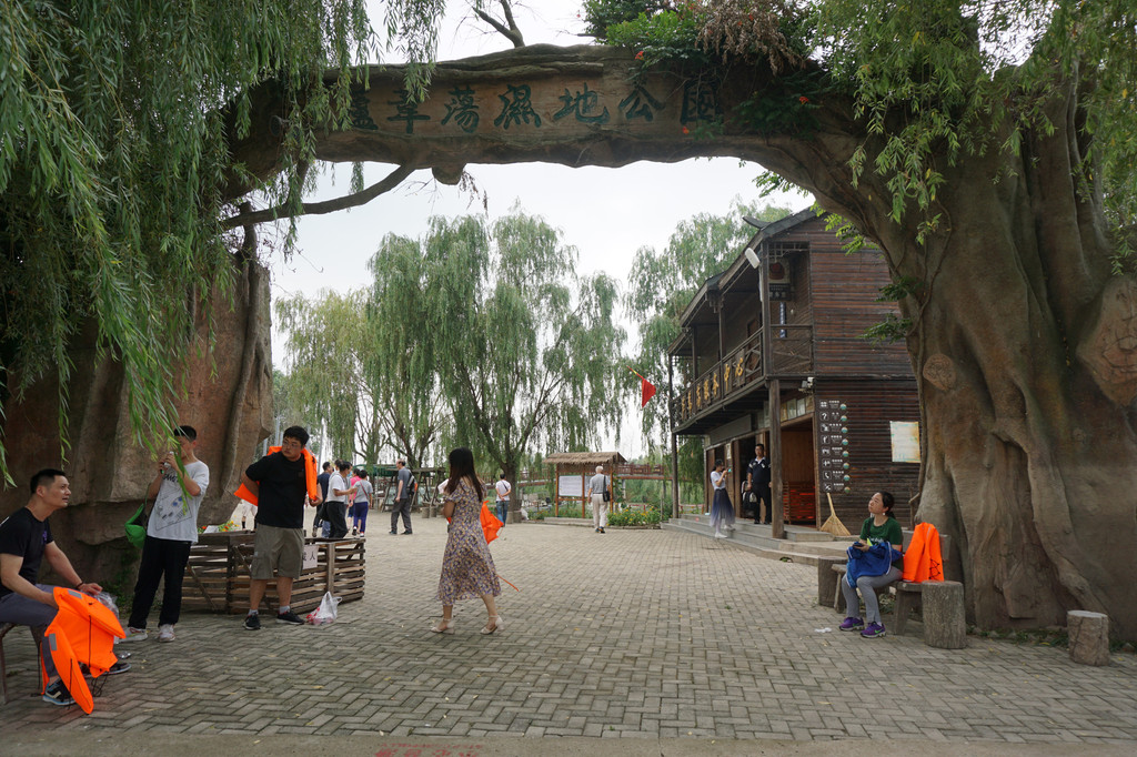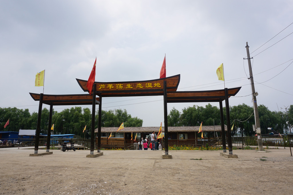 来到了高邮湖畔的芦苇荡生态湿地。这就是芦苇荡公园的入门处,这里和我三年前来的光景差不多,还在修建中,多了一个这样的牌坊,有了大大的标识。简易的门板房就是售票处,颇为简陋。