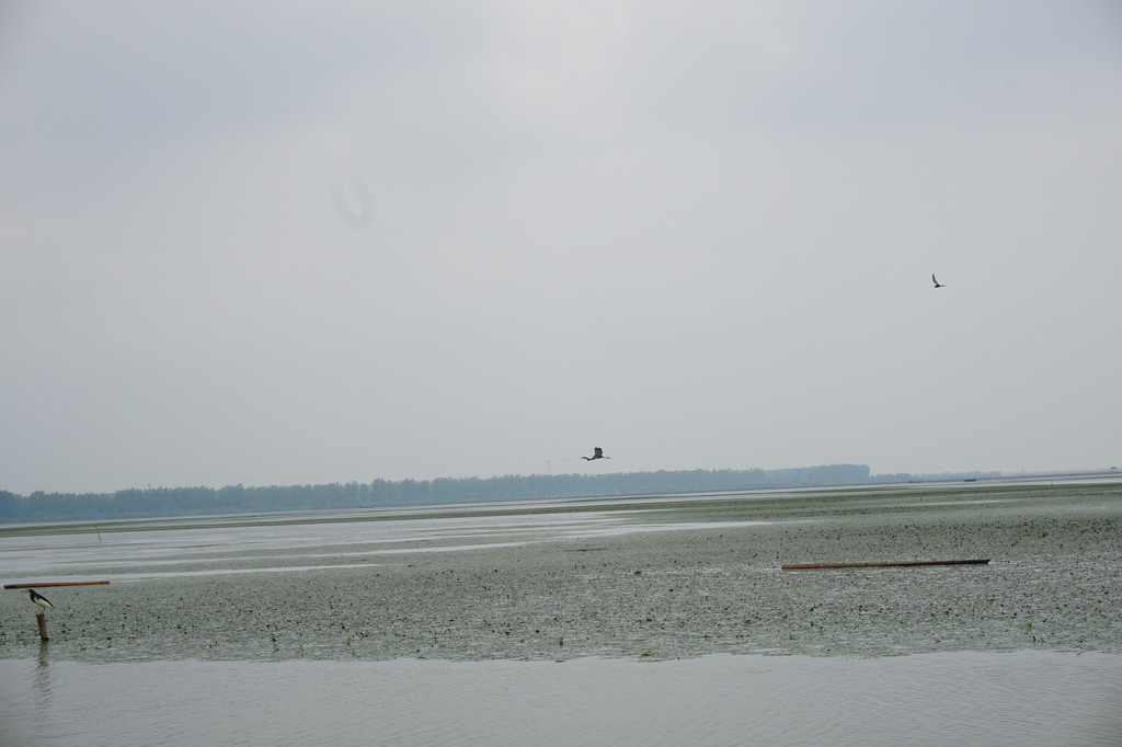 浩瀚的高邮湖,一眼汪洋似的望不到边际。多品种的水生植物点缀湖面。