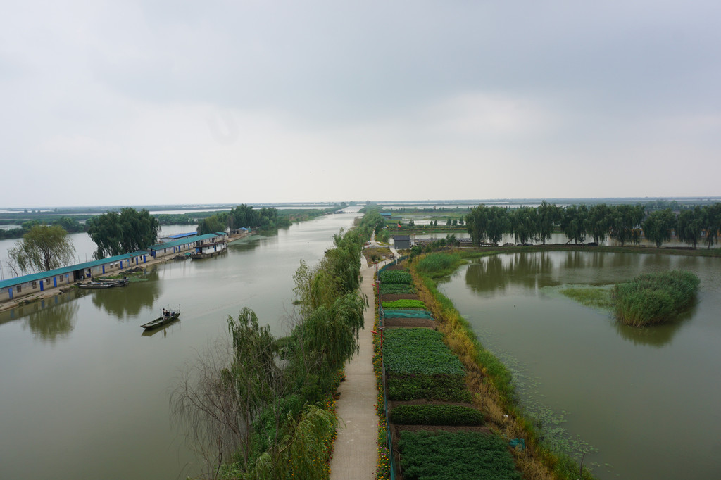 再远处的高邮湖湖面的水域被堤坝划分成若干片。