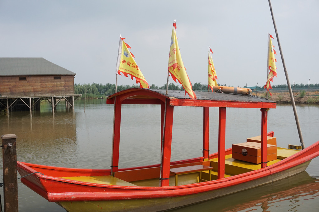 芦苇荡迷宫小码头的小木船,上有遮阳顶蓬,用蓄电池驱动。每艘船可以乘坐十人,每个人50元。