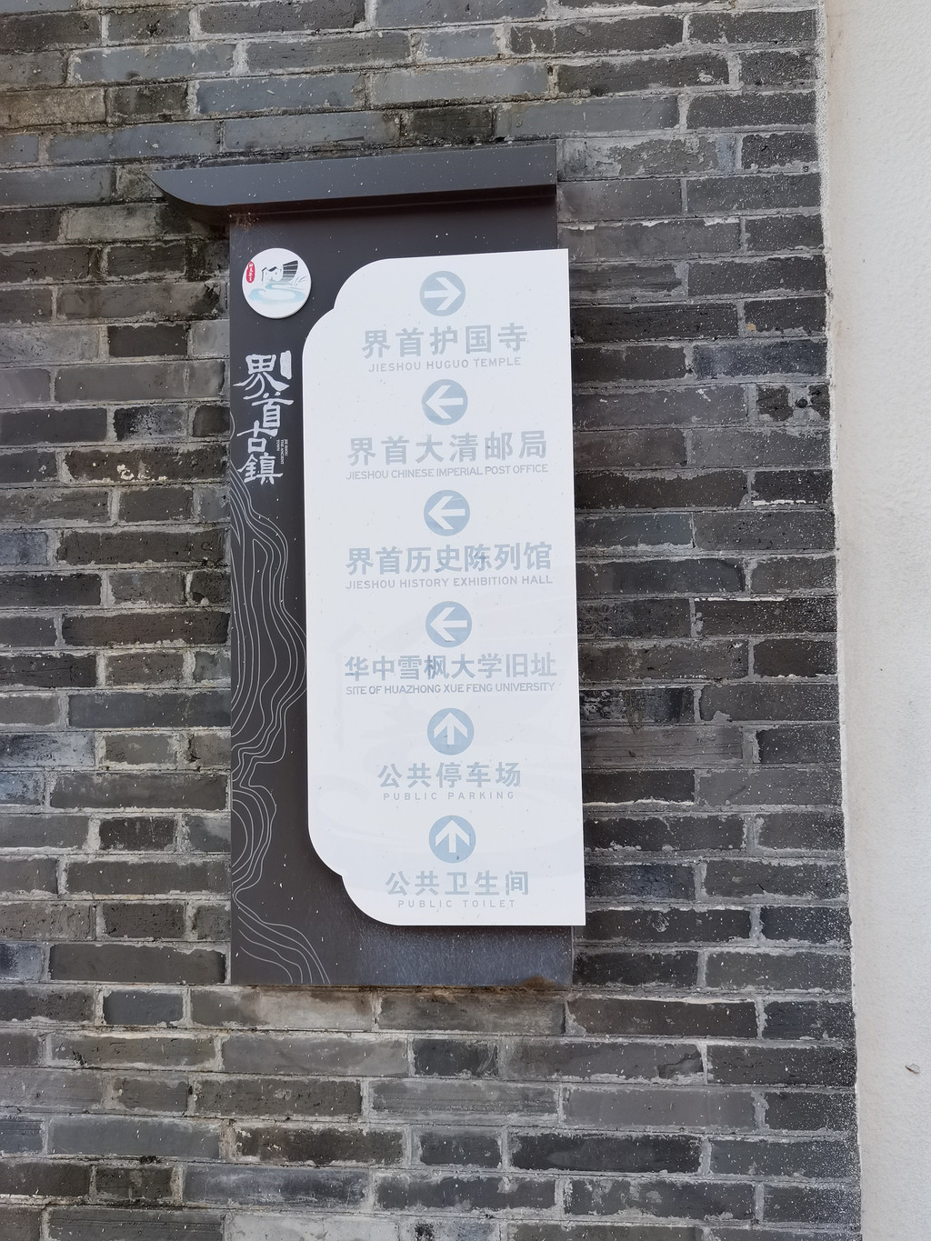 开着导航,经过一个大大的标着“界首古镇”的门楼后,并没有看到哪里有成片的古建筑或仿古建筑。镇子真的不大,与普通的乡镇在外观上没有什么不同,真到看到一块嵌在墙上的路牌才大致知道主要的景点是:护国寺、大清邮局、历史陈列馆、华中雪枫大学旧址。可能因为天热、游人稀少,所以有的景点没有开放,只参观了护国寺和华中雪枫大学旧址。
