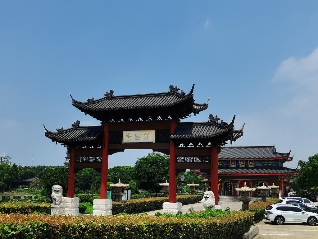 穿过一道长长的廊桥,才能到达在江心小洲上的镇国寺。镇国寺始建于唐代僖宗年间(公元874年),寺门前立着一尊手持净瓶的观世音菩萨金身塑像,寺内有天王殿、大雄宝殿、五百罗汉堂等殿宇。