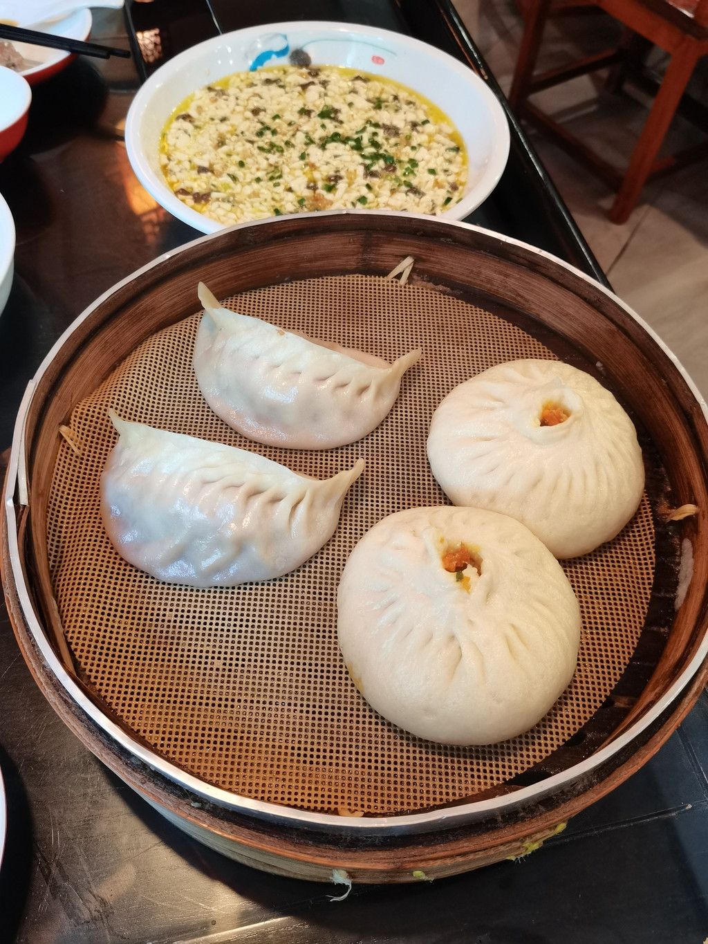 先说说一个误区。中午12点,我在网上搜到一家据说是高邮当地人比较喜爱的“张记酒楼”。由于担心太火爆,先打电话过去问问中午还有座位不,接电话的美女没有回答是否有座位,而是告诉我“我们现在主要是做早点的,没有中餐。”我听了以为中午不营业,正好看到景区门口是“冶春”的高邮店,便走了进去。结果,一进去服务员问我“您是要吃早点还是中餐?只吃早点的话在前台点餐,中餐在座位上点餐,我给您拿菜单。”再看看前台的早点菜单,这才恍然大悟,原来早点也是可以卖到中午的。而中餐不是指中午这一餐,而是指包含炒菜、汤煲等等的大餐。早点主要是包子、面条、各式冷盘,中餐的菜单上其实也有早点的那些品种。