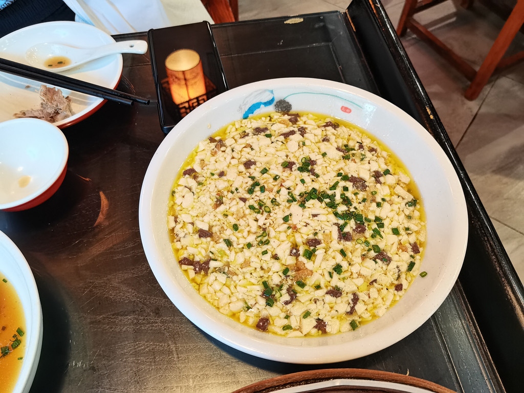 现场吃到的汪豆腐是用米粒大小的豆腐丁、鸭血(或猪血)丁、加上油渣丁烩制而成,再洒上了大量的葱末。确实很油、很烫,可是除了咸味和猪油味以外,没有特别惊艳的地方。