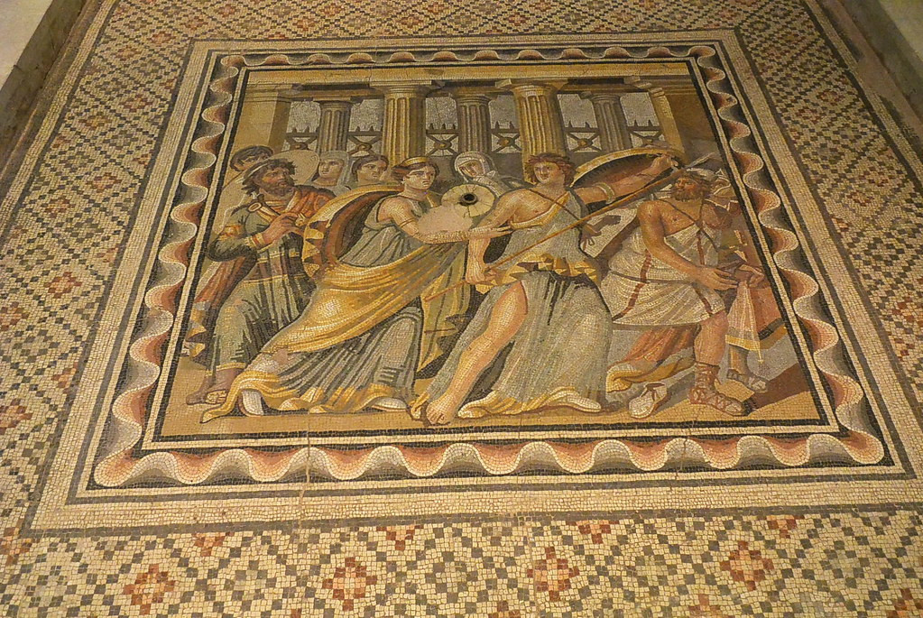 这幅《吉普赛女孩》已经成了加济安泰普的城市标志,不但博物馆的文创作品上有她,连城里高档餐厅的餐盘上都是她的头像。其他的罗马巨幅拼贴画也令人震撼,像这幅《奥德修斯认出阿喀琉斯》取材于荷马史诗:希腊联军出发攻打特洛伊之前想邀请武功最高的英雄阿喀琉斯一同出征,阿喀琉斯得到预言说自己将死于特洛伊战争,于是不愿出征,化妆成女人隐藏在塞浦路斯国王的诸位公主当中。足智多谋的奥德修斯设计给各位公主献上珠宝和兵器,结果只有阿喀琉斯一人不爱珠宝爱武装,于是被轻易认出,被迫加入希腊联军。