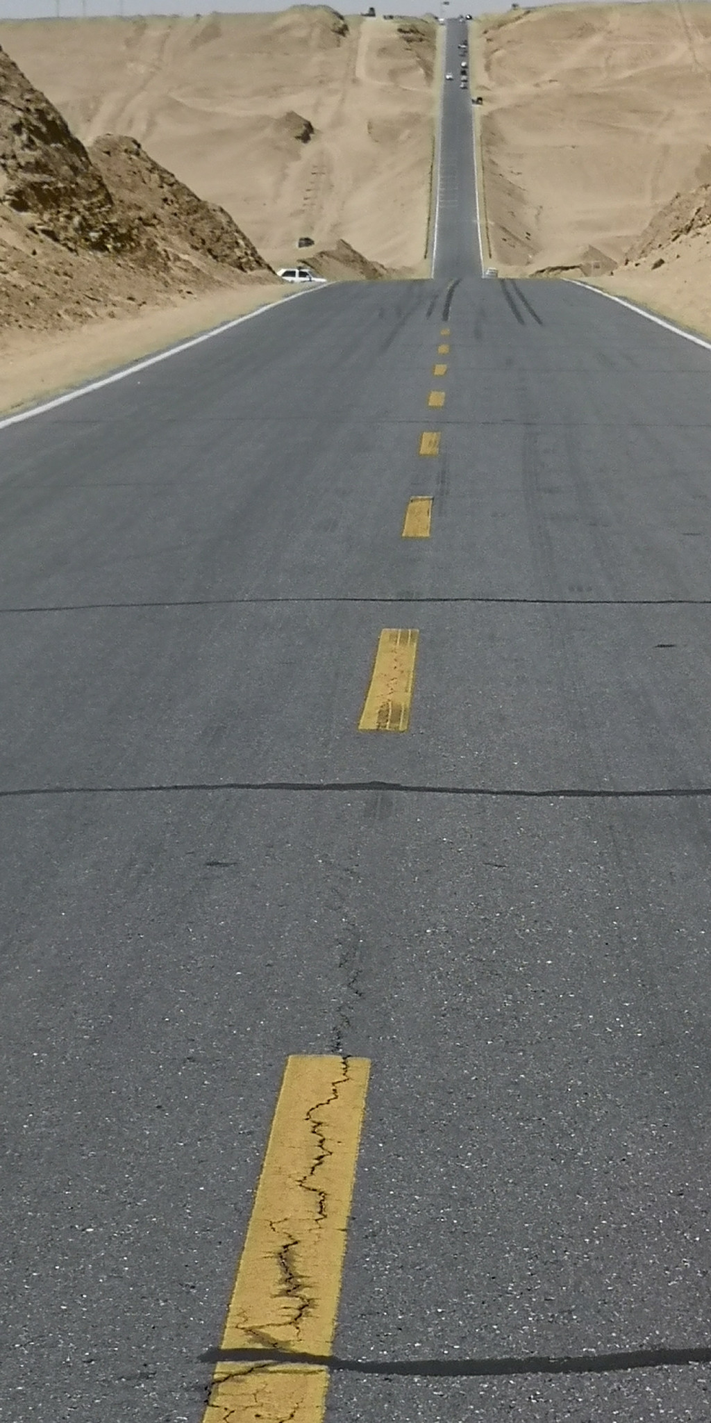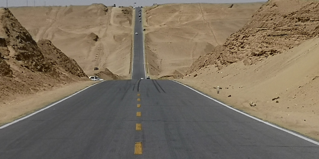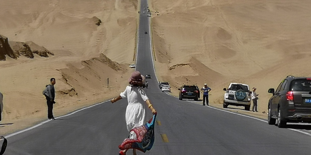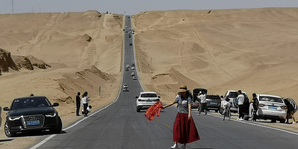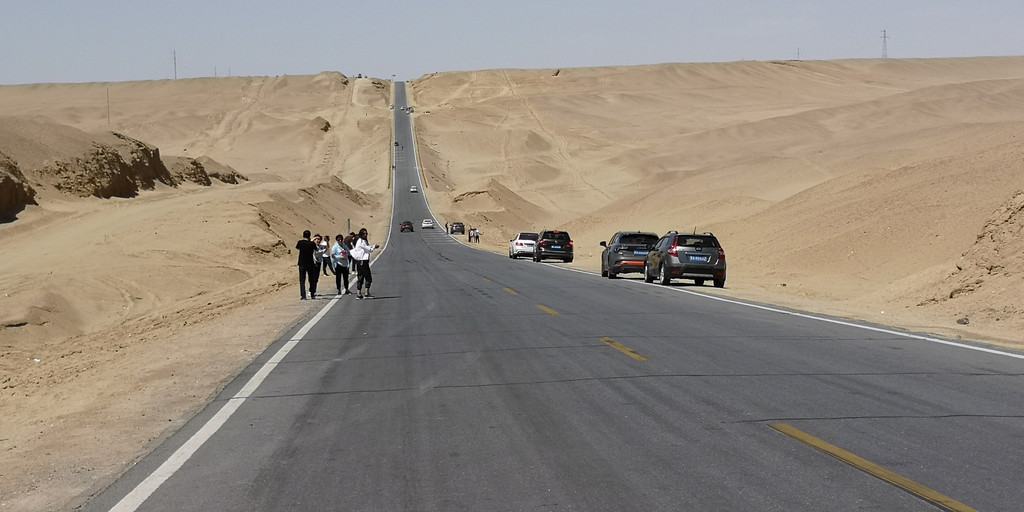 离开东台吉乃尔湖,我们沿着315国道向大柴旦翡翠湖出发。315国道这段行程上有一段U型公路,是所有至此的游客必然下车拍照的地方。不管你从哪个方向过来,都会把汽车开到U型公路的另一端,回头一望,无比陡峭的公路感觉是从云端倾泻。游客们在U型公路的低洼处,等没有汽车经过时,就会跑到公路中间肆意比划。从青海回到家后,看到新闻里青海交警的公告,禁止游客在公路中间拍照,以保证游客的生命安全和汽车的畅快通行。
