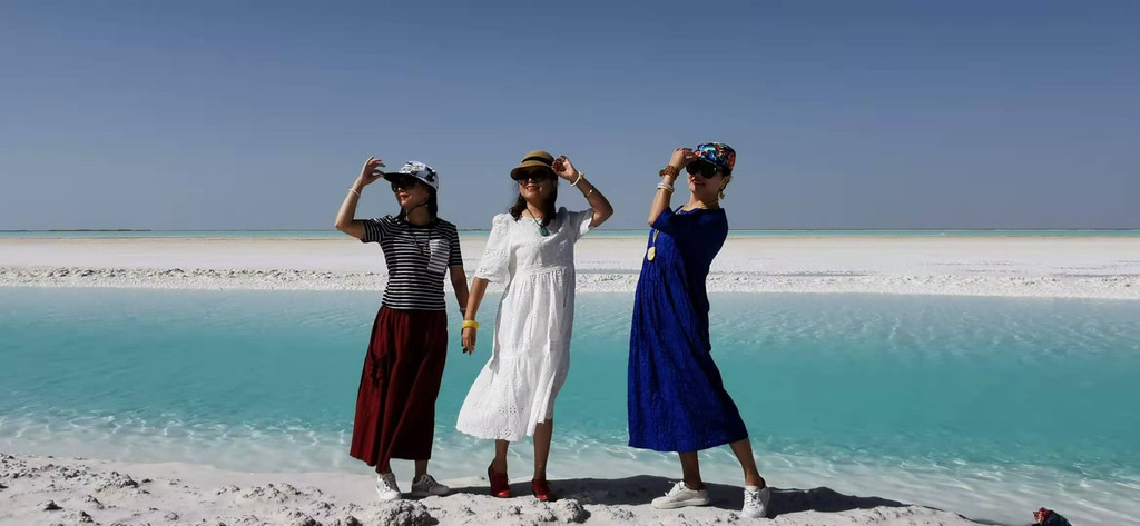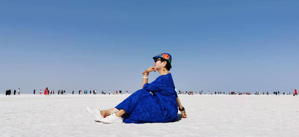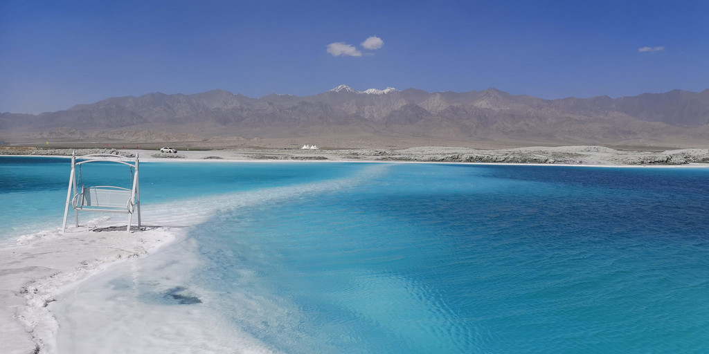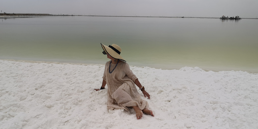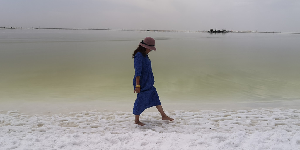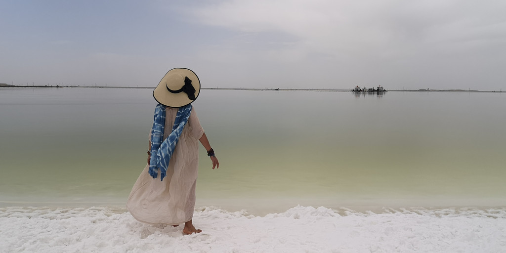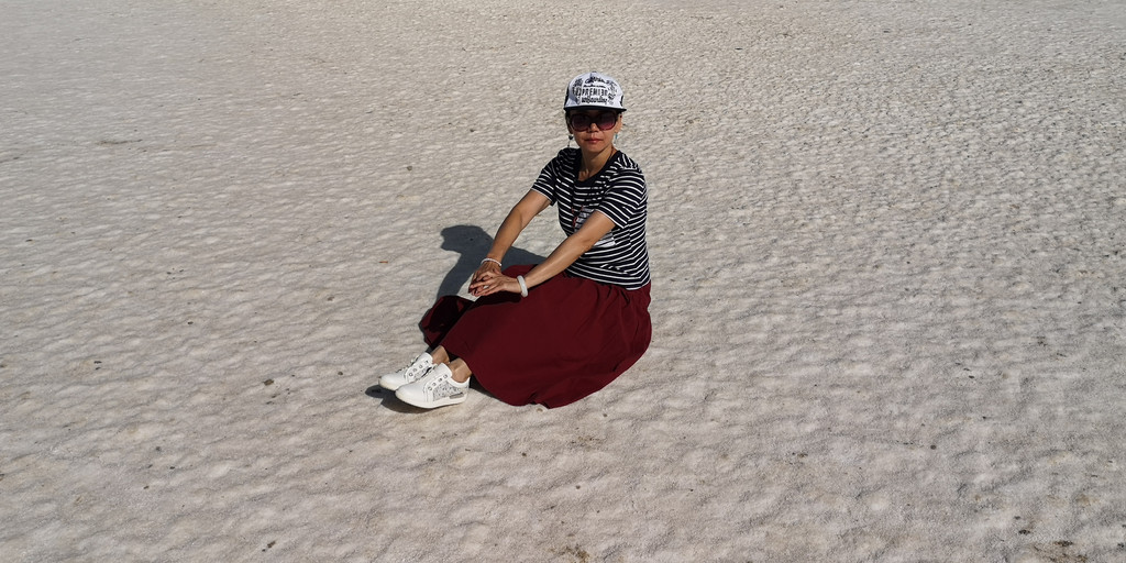这是第六天早晨,我们从雅丹地质公园出发,开车去了东台吉乃尔,一进入景区,真的是惊艳到我们,宽阔的、如雪的盐滩扑面而来,远远湖面如一条淡蓝色纱带,盐滩、湖水如镶嵌在天地间。我们心怀激动地进入,忍不住在盐滩上肆意的摆拍。