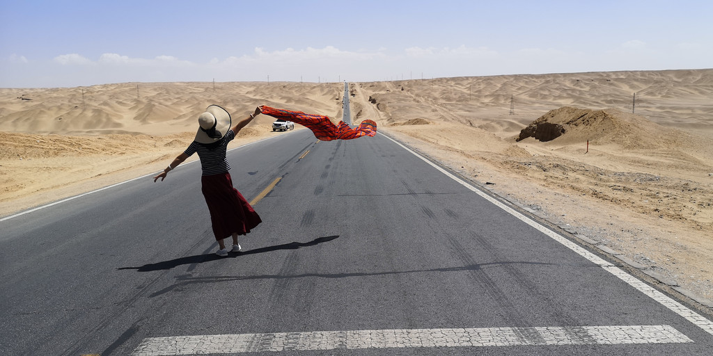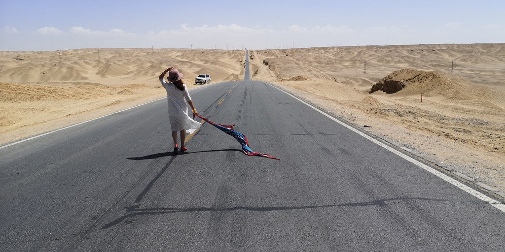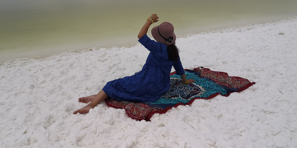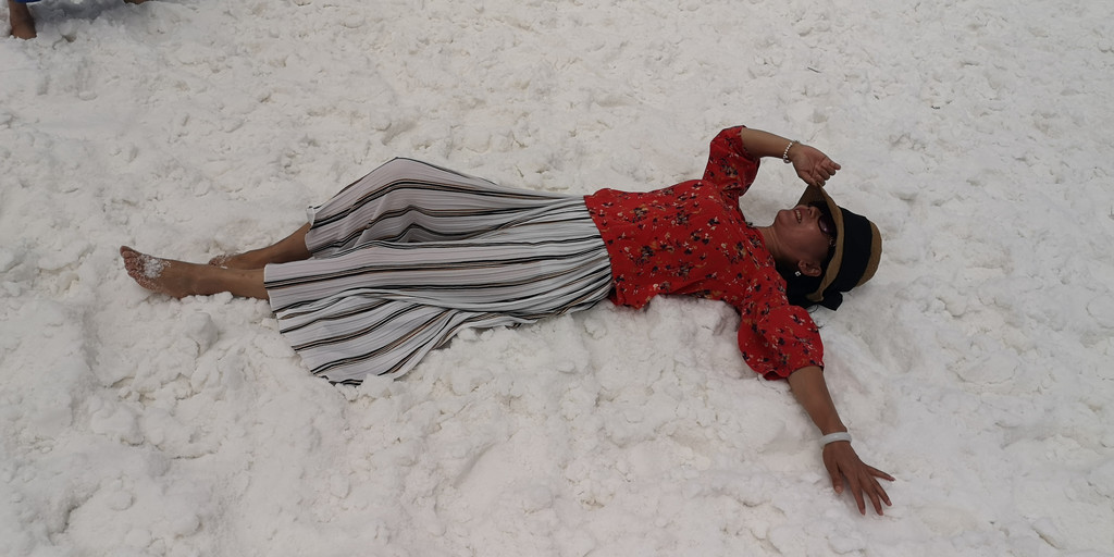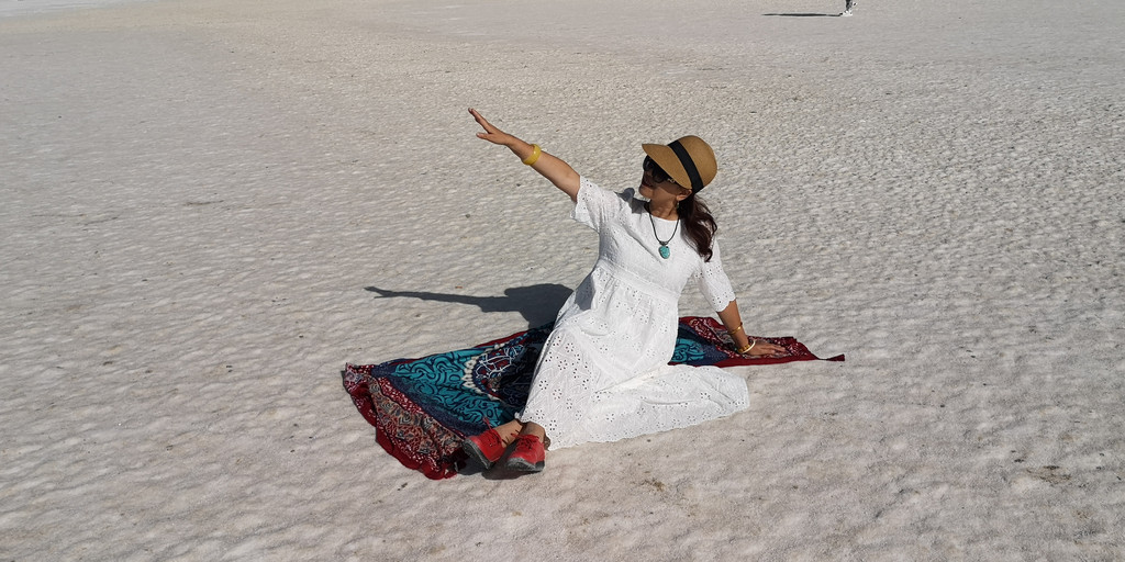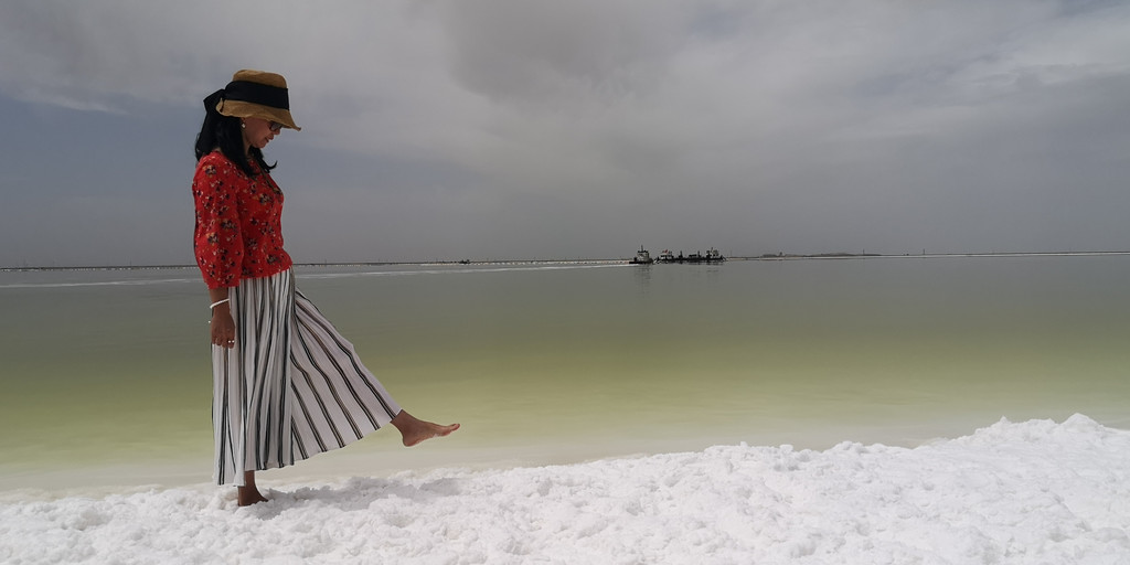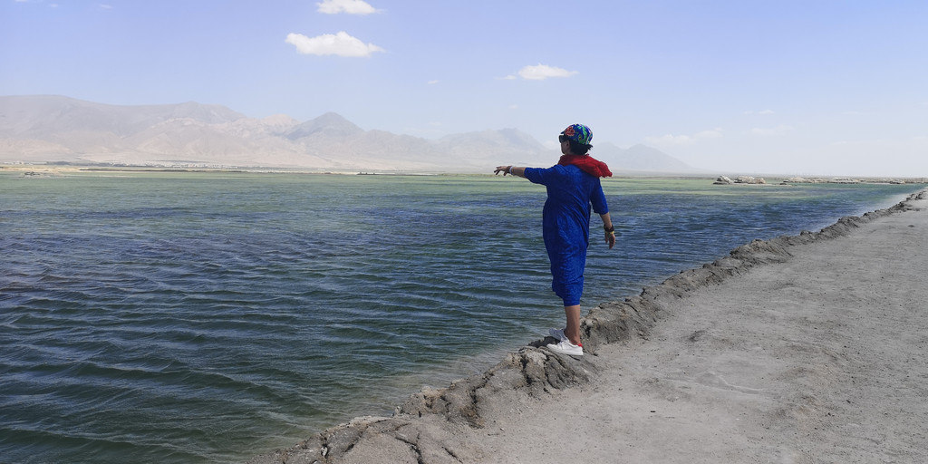 这是第六天早晨,我们从雅丹地质公园出发,开车去了东台吉乃尔,一进入景区,真的是惊艳到我们,宽阔的、如雪的盐滩扑面而来,远远湖面如一条淡蓝色纱带,盐滩、湖水如镶嵌在天地间。我们心怀激动地进入,忍不住在盐滩上肆意的摆拍。