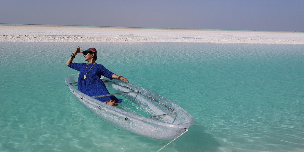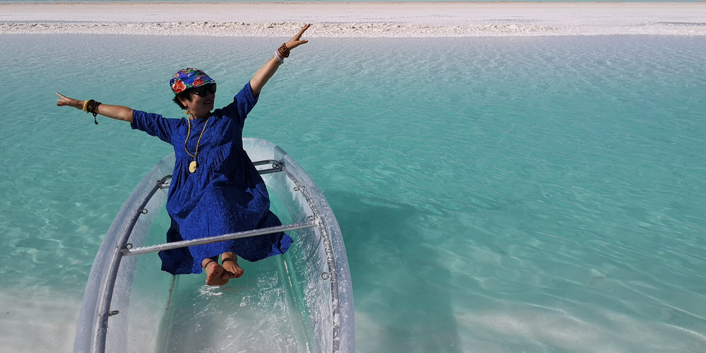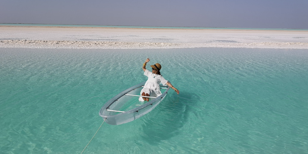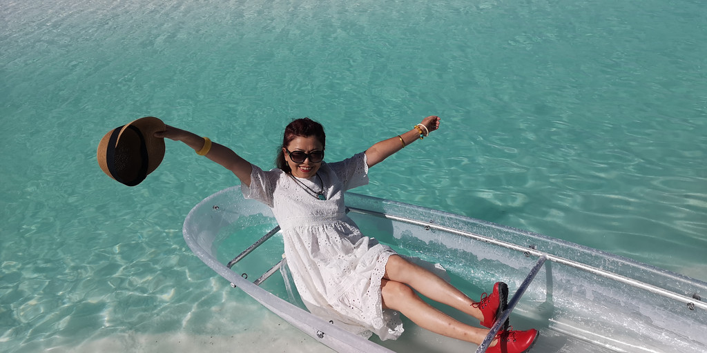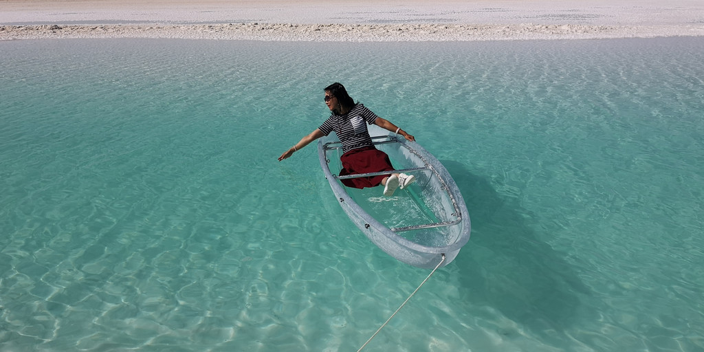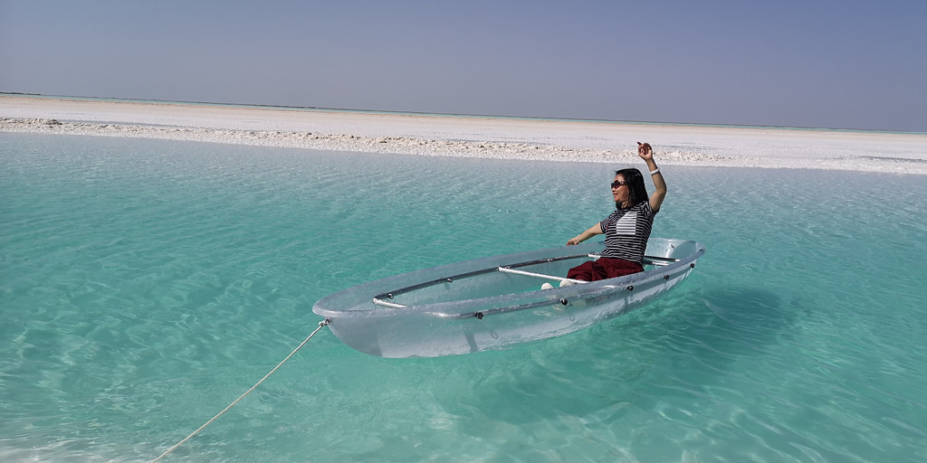 更让人兴奋的是当地老乡在湖边弄了一条透明的船供游客照相。船的一头牵着绳子,老乡把船推向湖心,然后每人有3分钟拍照的时间,再用绳子把船拉回岸边。就这样,岸边排着长队等待着登船拍照,队伍中大多以女性为主。