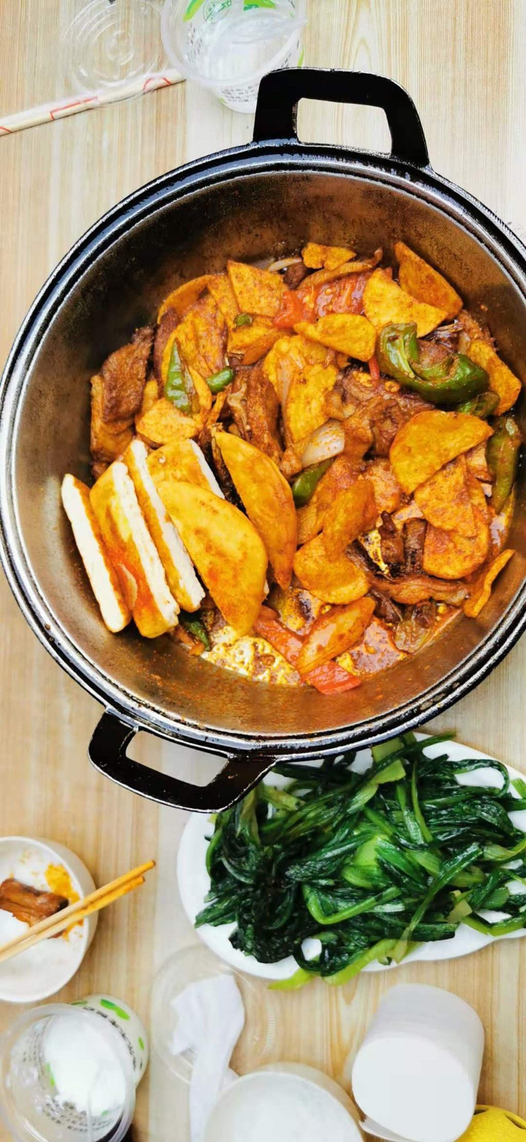 结果这里就是把羊肉、菜和面饼放在铁锅里炕着吃的地方特色餐饮。味道很好,只是四川去的我们,不太会在晚上吃那么多的肉。我们点了少许食物,可依然要很努力地吃。