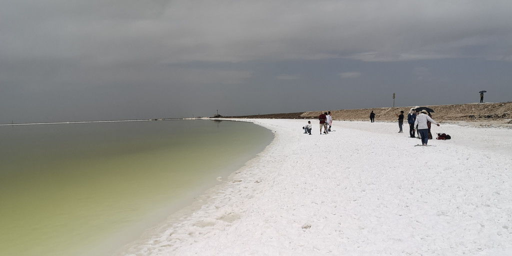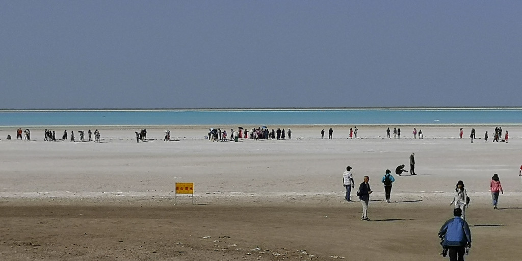 来到盐湖边,天公不作着,尽管气温非常高,但是太阳没有出来,灰蒙蒙,不见蓝天白云。