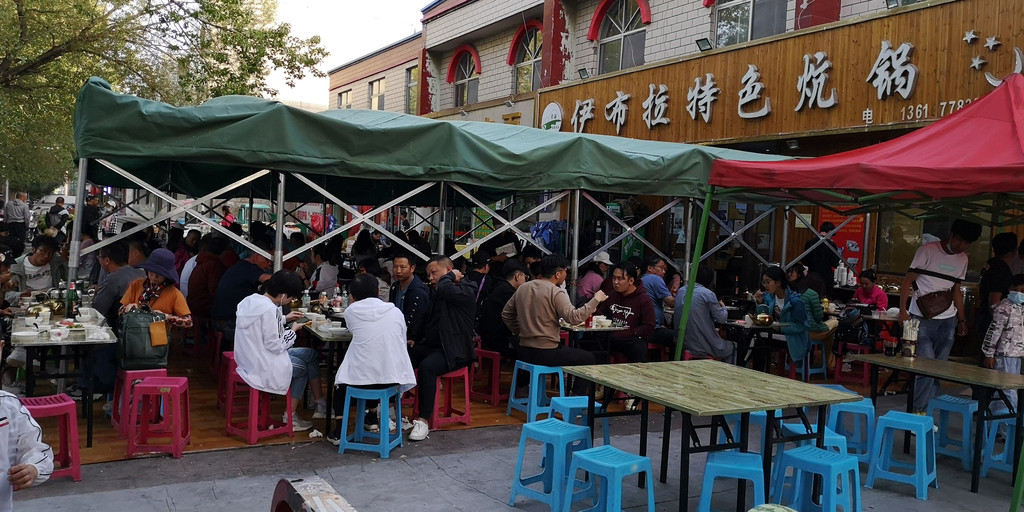 收拾好行李,我们到大柴旦市区寻找晚餐的地方,来到市区热闹的地方,见一处小铺外人头攒动,热闹非凡,靠近一看,是一清真饭铺,它的热闹和旁边其它铺面形成鲜明对比,这在疫情期间非同醒目。我们赶紧找一座位坐下,才认真打听这是吃什么?怎么吃的饮食。了解清楚以后,我们决定试试。