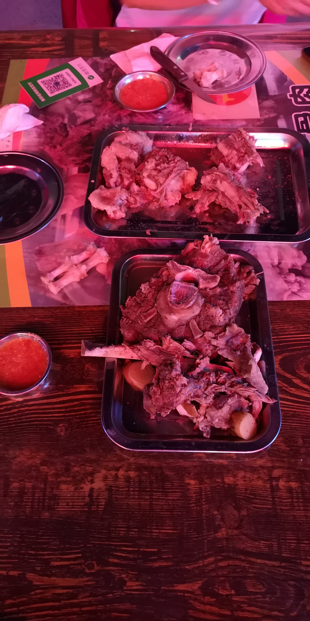 回到格尔木已经晚上9点了,饿了一天我们只找到羊肉店还开门营业,点了羊排和手抓肉,一上桌吓我们一跳,晚上吃这样多的肉怎么得了。