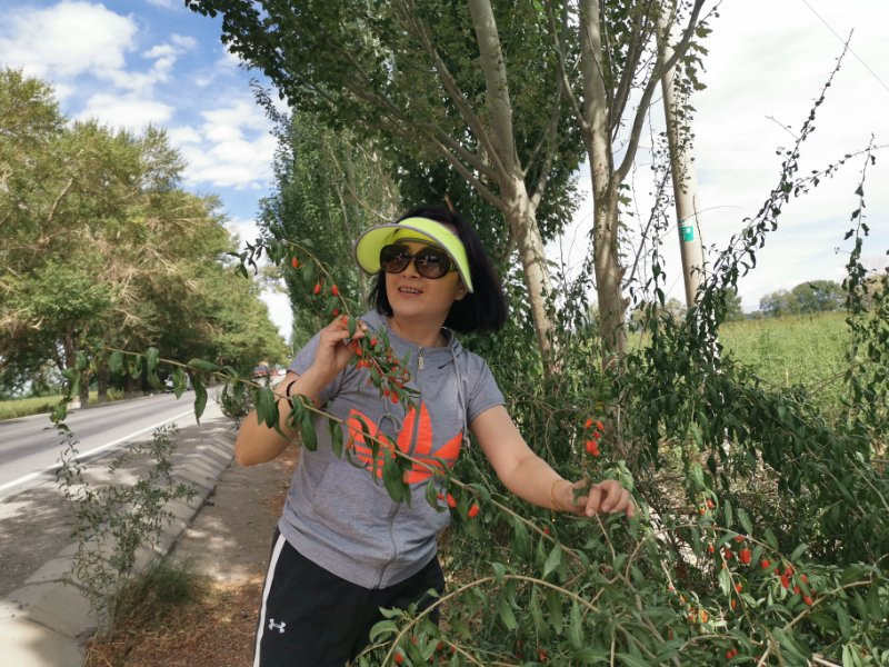 。一路走着,公路两沿有人工培植的枸杞,偶尔也会有“出墙红杏”的枸杞穿过铁丝网的禁锢,探出身枝供路人采摘(不知这种没得人管理依然长势喜人的枸杞算不算野生的)