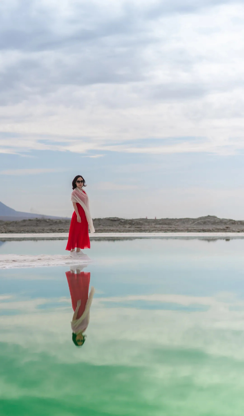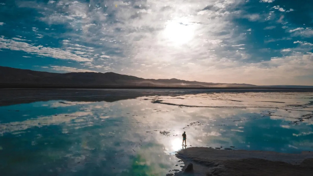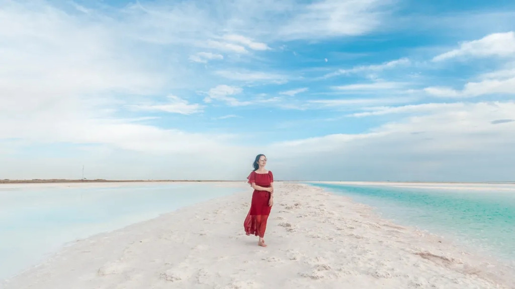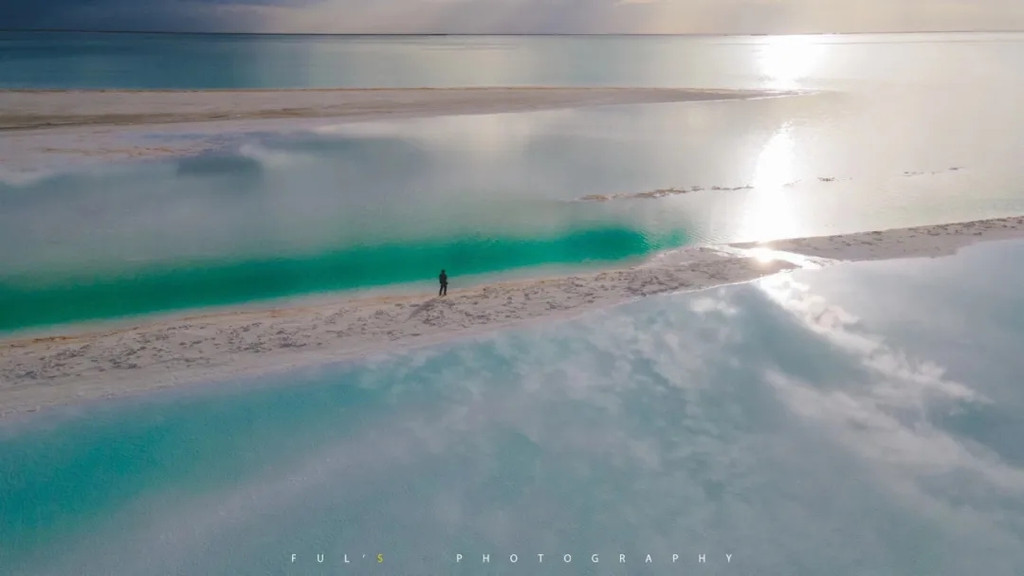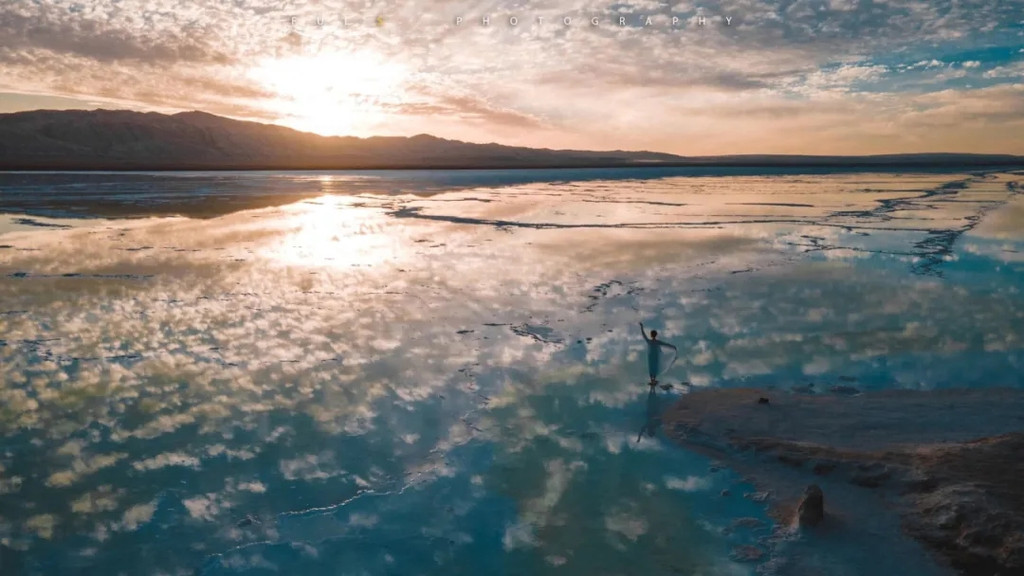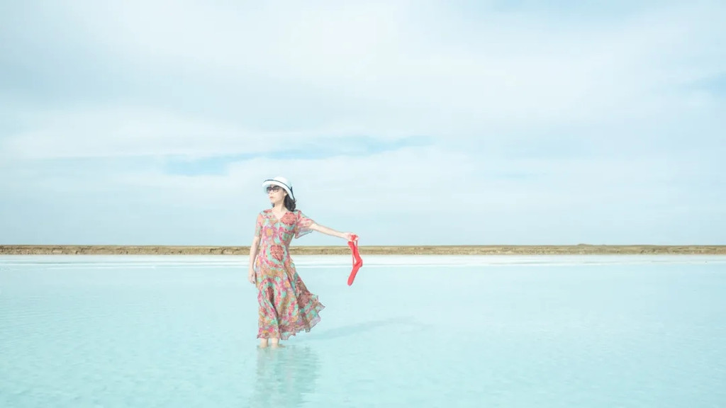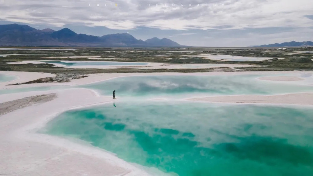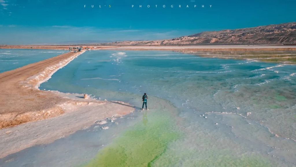 走在狭长的盐晶堤岸上漫步,两边都是蒂芙尼蓝的清幽湖水,恍惚间竟忘记了自己身处戈壁深处。
