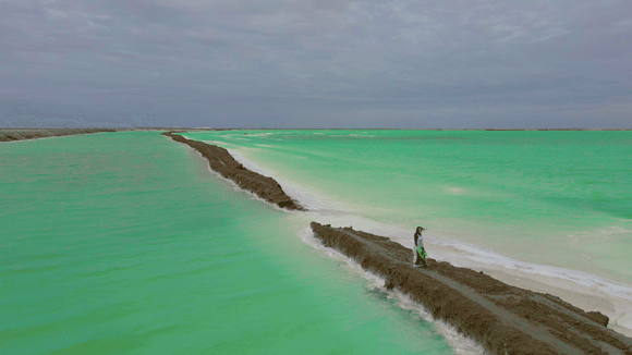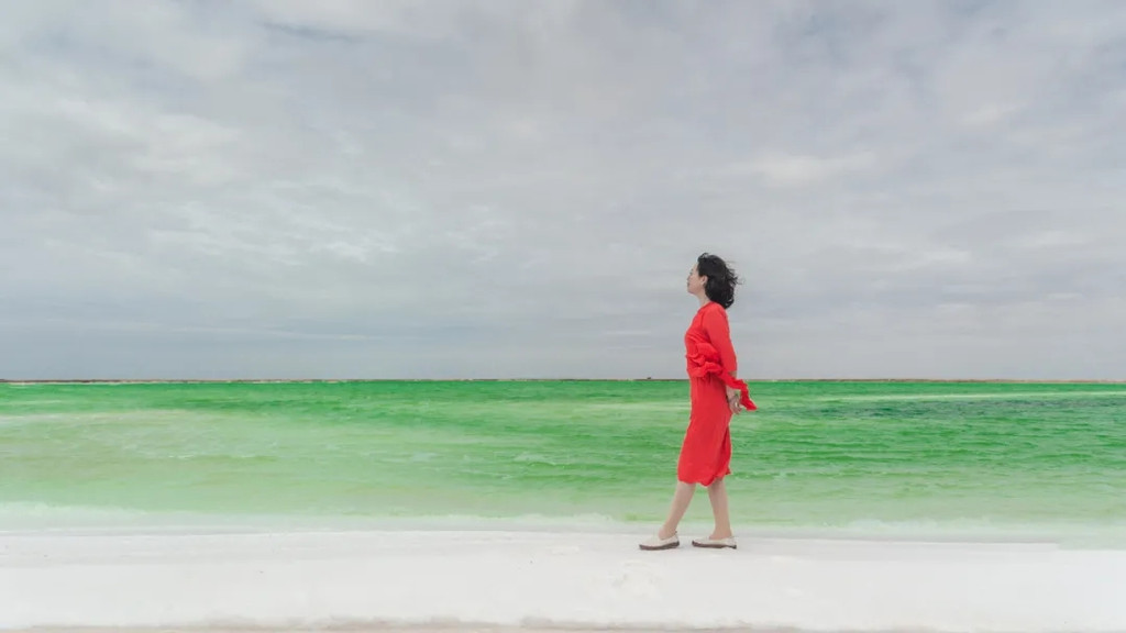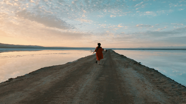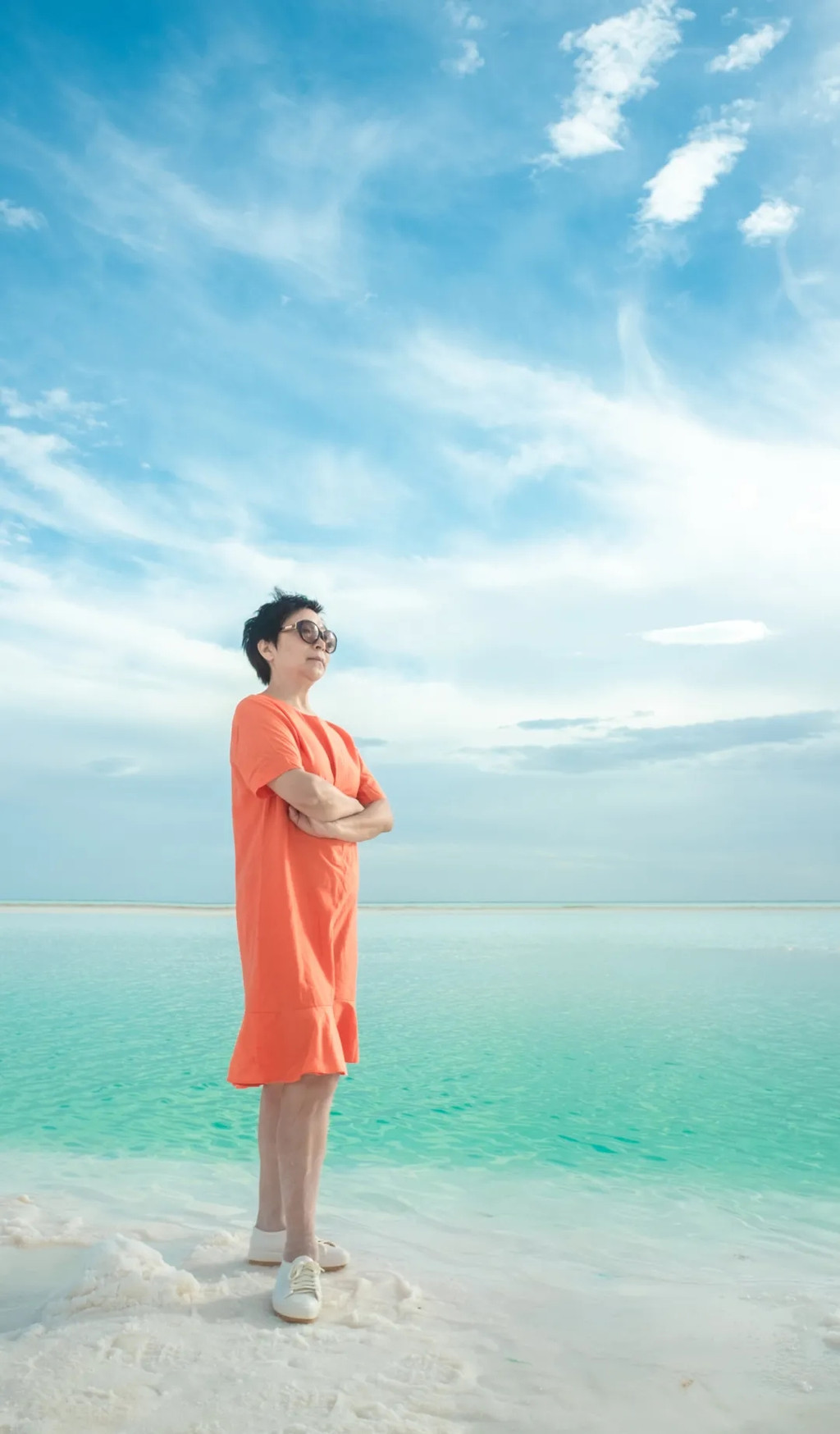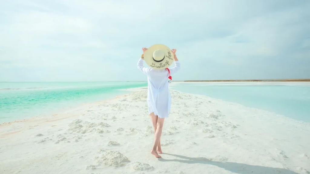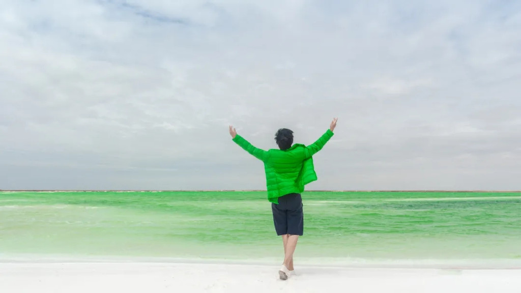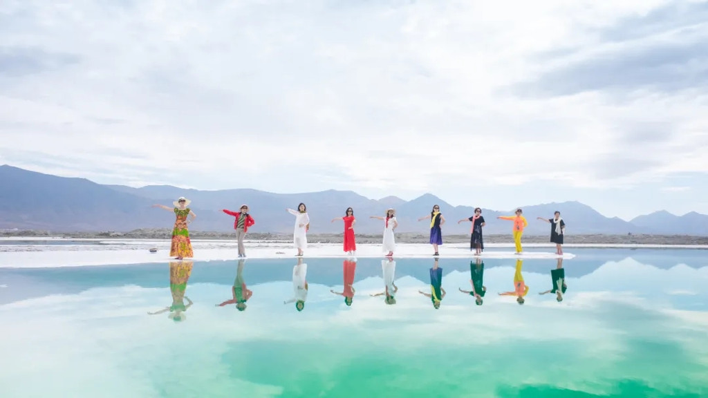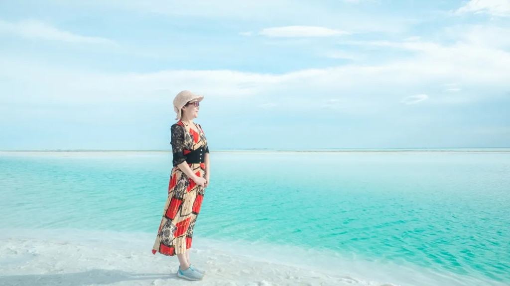 走在狭长的盐晶堤岸上漫步,两边都是蒂芙尼蓝的清幽湖水,恍惚间竟忘记了自己身处戈壁深处。