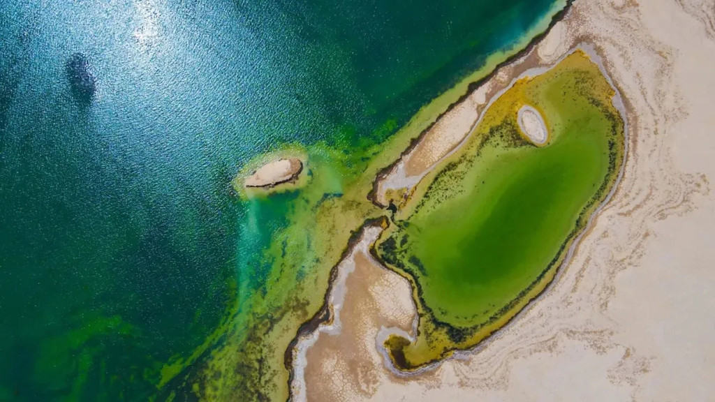 继续前行,在西台吉乃尔湖与东台吉乃尔湖之间,有一片沙漠与湖水交织出的美丽画卷,这就是美丽的乌素特水上雅丹。
