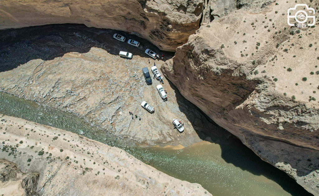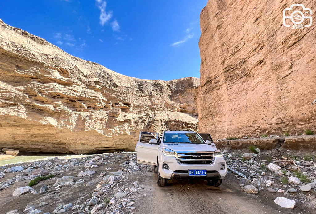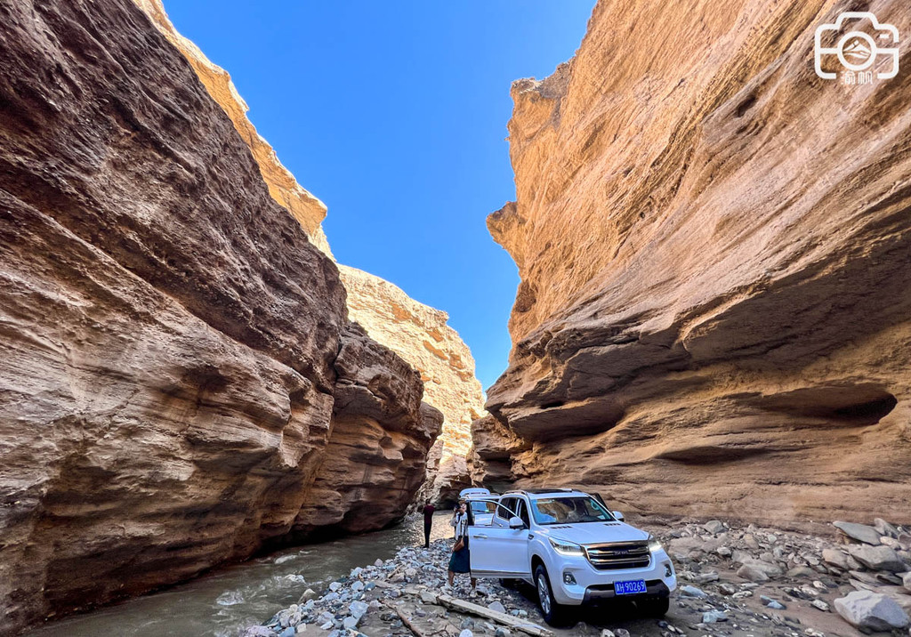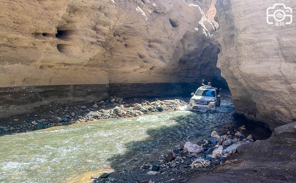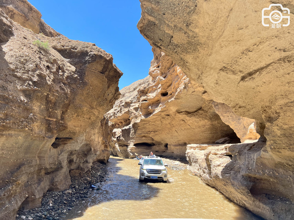 峡谷中有一条小河,据说是昆仑河的支流,边上又没有修建观光步道,所以若想到里面游览,只有驾驶越野车在狭窄的峡谷中涉水而过,水花四溅,无比清凉,尤其是七八月份,全国各大城市都迎来40度高温的时候,峡谷中却凉风扑面,无比惬意。