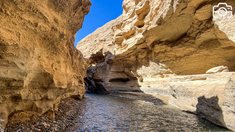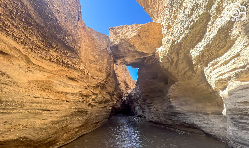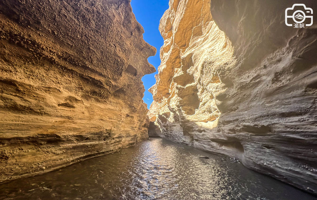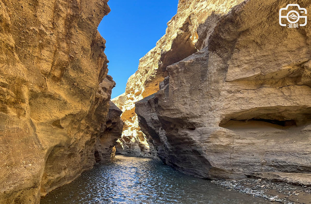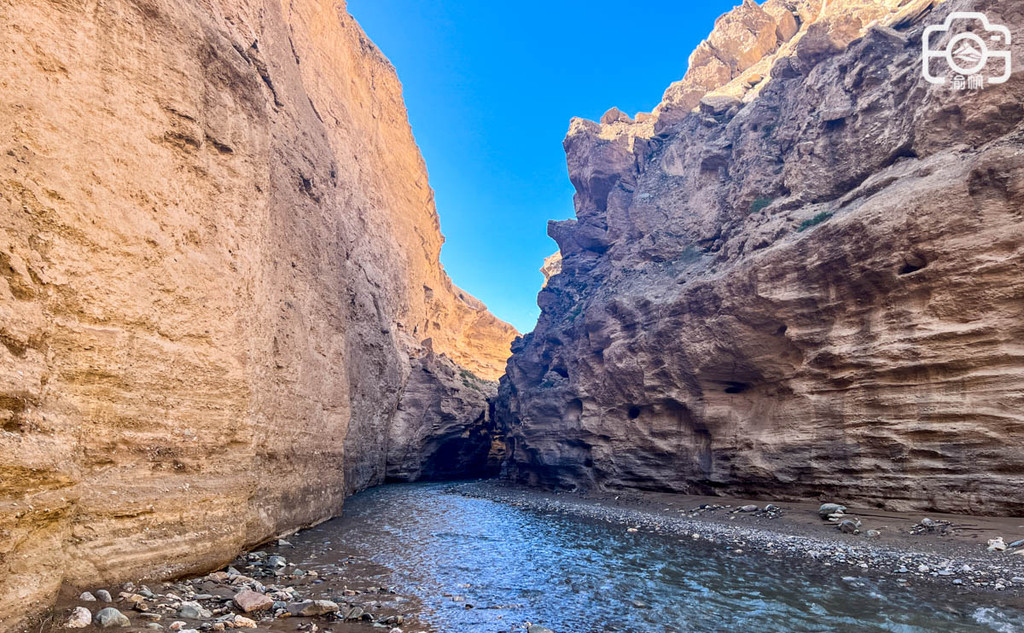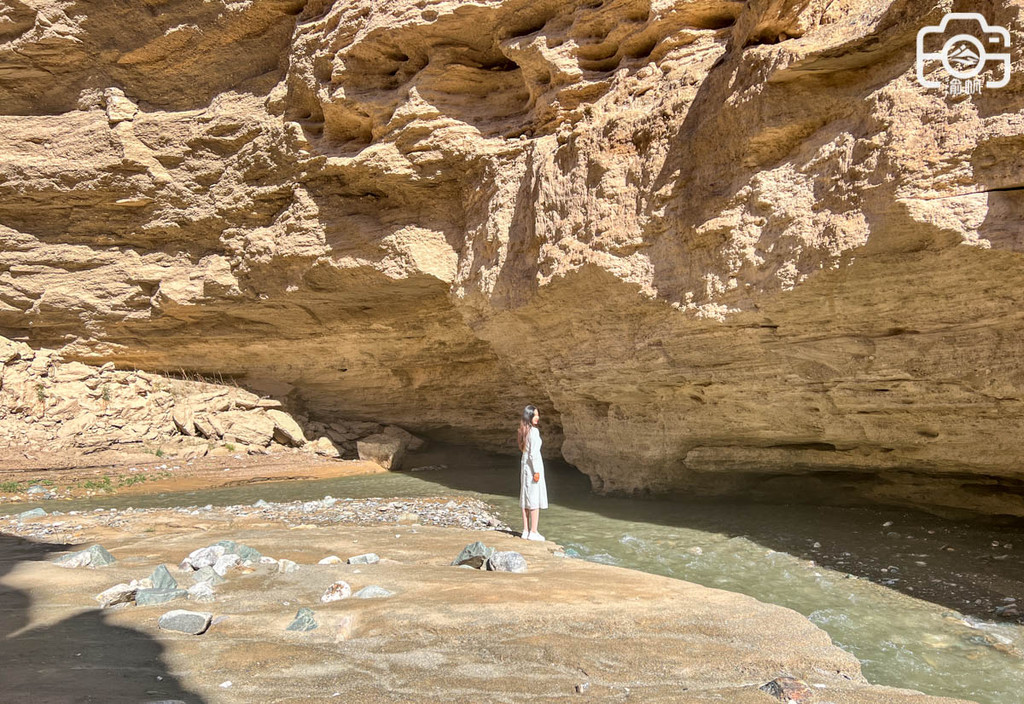 峡谷中有一条小河,据说是昆仑河的支流,边上又没有修建观光步道,所以若想到里面游览,只有驾驶越野车在狭窄的峡谷中涉水而过,水花四溅,无比清凉,尤其是七八月份,全国各大城市都迎来40度高温的时候,峡谷中却凉风扑面,无比惬意。