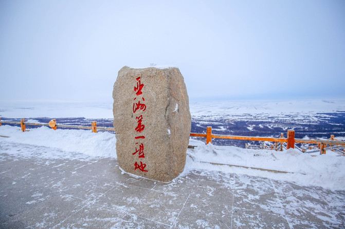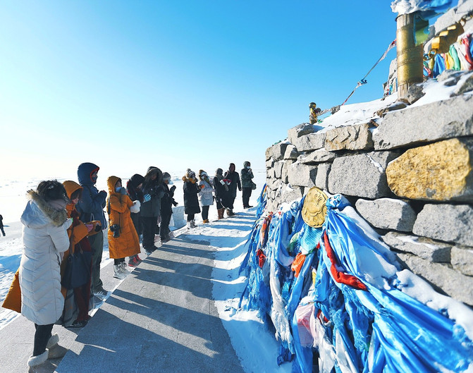 敖包,敖包上方的五彩风马旗在随风飘扬,敖包是蒙语的说法,也为“堆子”,人工用木、石头等堆起来的“石头堆、土堆” 。一般成圆形,是主要用来祭祀用的。雾凇与敖包在一起,形成另外一番特别的冬景,宁静又肃穆。