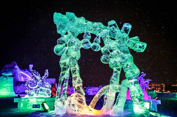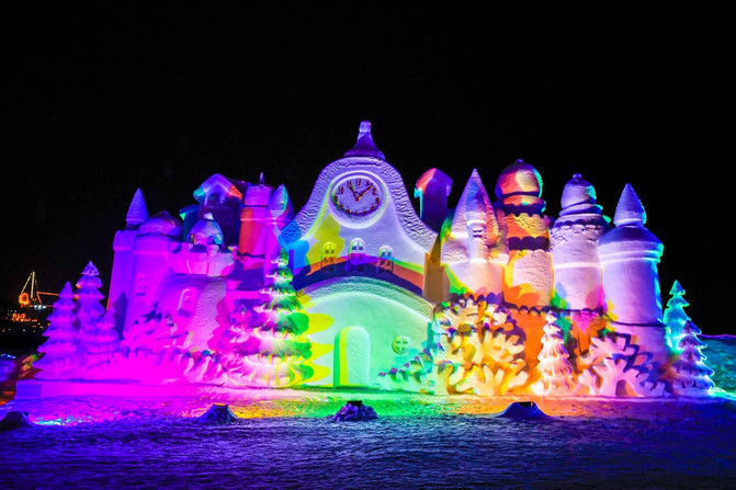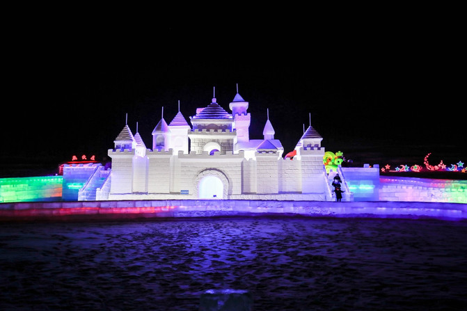 冰雕和雪雕最好区别之处就是,雪雕都是靠地上的彩灯投射发光,而冰雕是内置彩灯,可以自生发光。雪雕细腻,冰雕剔透。