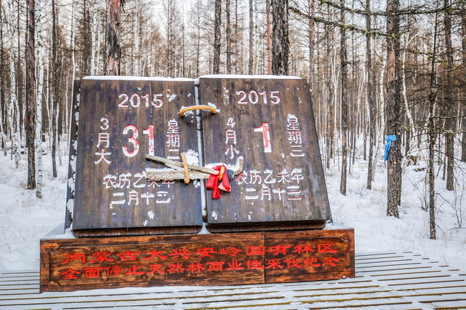 停伐纪念地仿佛一切在停伐的最后一刻,这里一切都禁止了一般,从2015年4月1日, 内蒙古大兴安岭 林区将全面停止天然林商业性采伐,林业工人将放下手中的斧头和油锯,彻底从“砍树”到护林的重大转变。