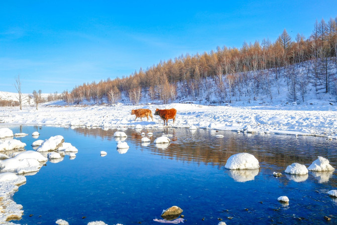 冬季,其他地方的水草早被厚重的冰雪覆盖,或者枯竭。所以牧民们都会在不冻河旁放牛,因为地热的原因,牛群可以在河面饮水,河边的水草也是极好的食材。