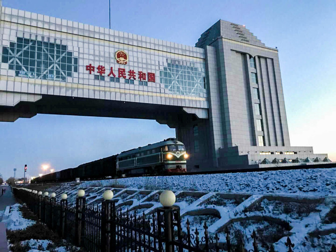 国门庄严肃穆,在国门乳白色的门体上方嵌着"中华人民 共和 国"七个鲜红大字,上面悬挂的国徽闪着的金光,国际铁路在下面通过。