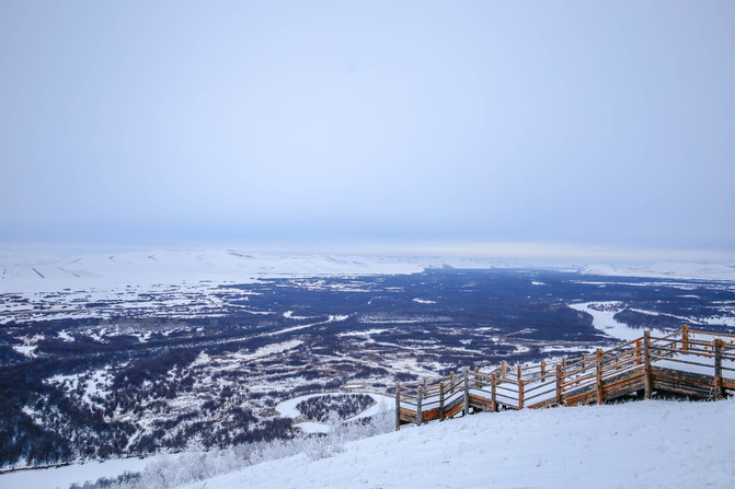 此刻,高处所在, 新建 的台阶之上,在阳光的斜射中,又是另外一种景致,看着远处的 根河 从这里蜿蜒流过,变成了白色的弯曲,形成了壮观秀丽的河流湿地景观。