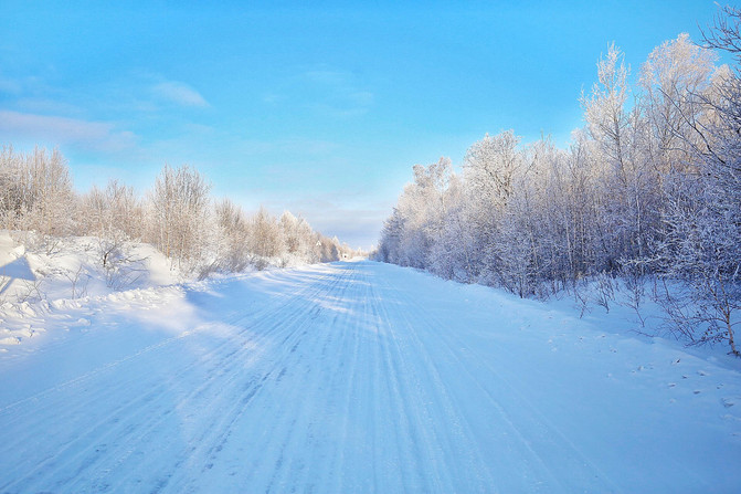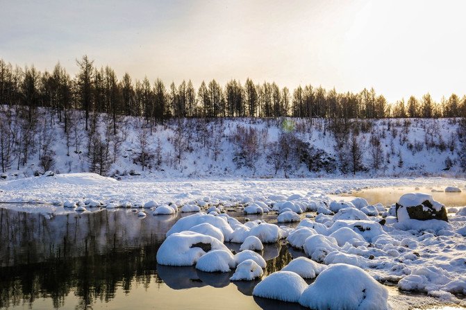 堆落在地上的白雪,就如厚厚的雪白毛毯。 根河 像一条银色的玉带弯弯曲曲地在平坦的草原上流淌。美轮美奂的雾凇仙境,银装素裹。零下58度的天气里,欣赏那仍然不会结冰的河水。银白的树木倒映在水面,冬季的童话世界。