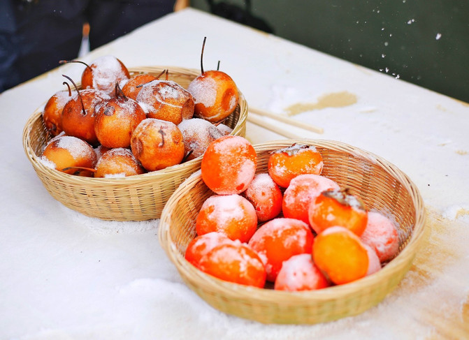 梨子和柿子放在室外,已经变成硬梆梆的冻梨和冻柿子,完全就是一个个冷兵器。这不禁让我想起明星胡可曾说过小时候,她爸爸拿冻带鱼打过她。想想,这得多疼吖。