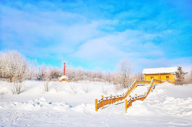 阿尔山 有 中国 小 瑞士 之称,当亲眼看到这童话般的雪景,犹如置身童话之中。粉蓝色的天映照绵绵白云,明黄色的小屋被厚厚的积雪覆盖着,被雾凇环绕着,这场景分明就是安徒生童话中的一般。谁说雾凇只有 东北 的美, 阿尔山 的雾凇才真的是靓爆镜。