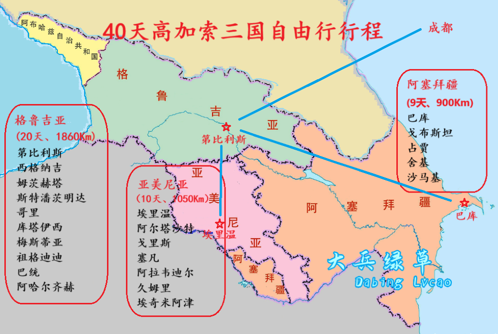在亚美尼亚停留 10 天,除在首都埃里温游览 2 天外,自驾 1050 公里,前往戈里斯、阿拉韦尔迪等地,戈里斯的悬崖修道院地势险要,给人强烈的视觉冲击,阿拉韦尔迪的修道院与现代战机设计师故里,让人感受到古老历史与现代文明的一脉相承。最后一天返程,给我们留下了满满的回忆。下图是我们40天高加索三国自由行行程图。