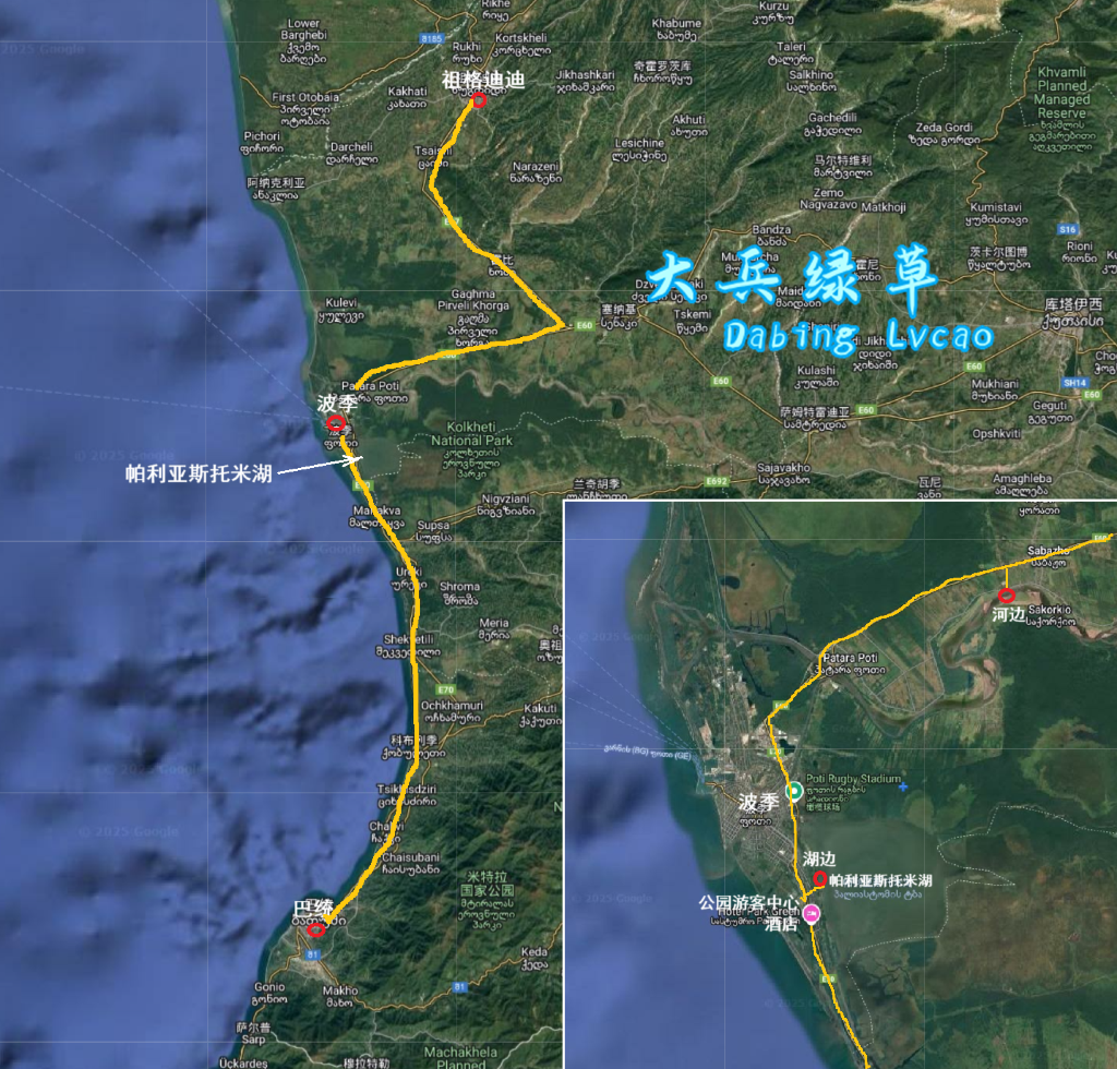 根据搜索到的有限信息,科尔基斯国家公园没有明确的边界和景点,我们分析地图后决定,将格鲁吉亚最大的湖泊——帕利亚斯托米湖作为我们探访的重点。