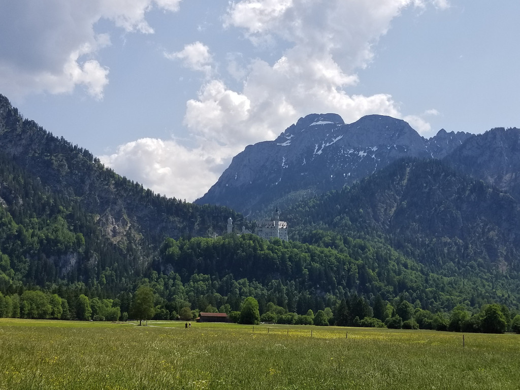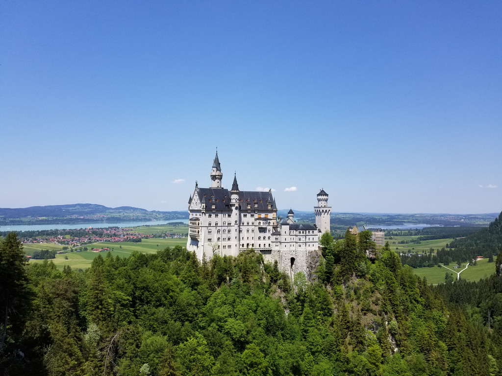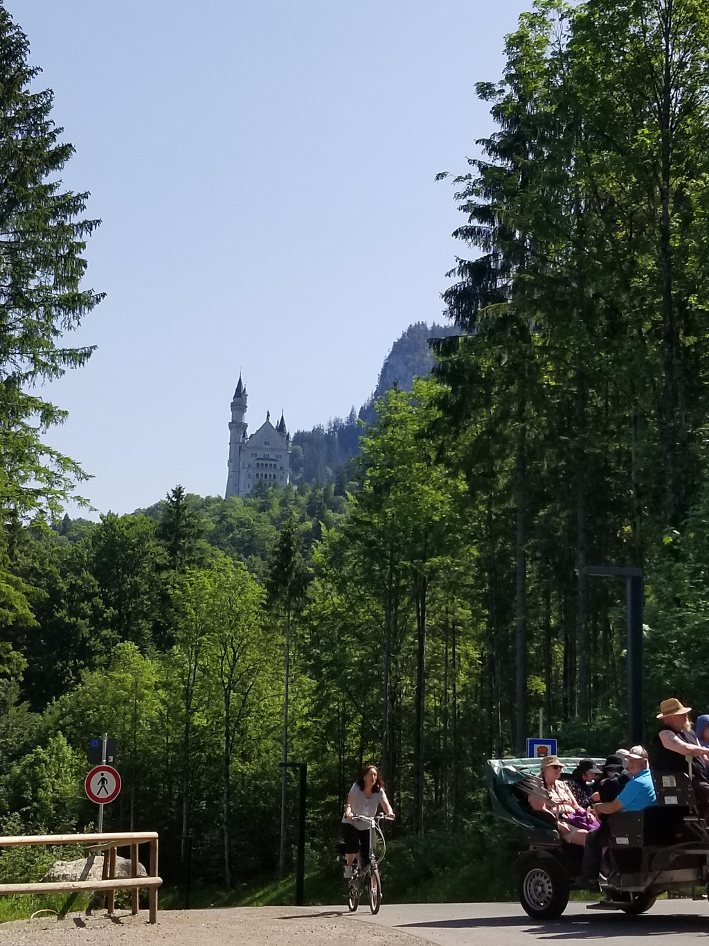 菲森——国王领地,巴伐利亚的浪漫之魂,幽静的湖泊与雄伟的山峰交相辉映,菲森老城及附近王宫的文化与艺术气息扑面而来。菲森的历史可以上溯至2000年前古罗马时期,时至今日吸引了许多来自不同国家的游客,漫步其间可以欣赏到巴伐利亚风格的建筑。这一路我们住过的大小酒店早餐都很不错,种类丰富味道可口,心满意足地补充完能量我们向新天鹅堡进发,住在菲森的一大好处就是离天鹅堡非常近,开车不到10分钟我们已经停好了车买完了门票。从山下步行到天鹅堡大约30分钟,我们俩决定走着上山,一路上新天鹅堡以不同角度出现在我们视野里的,终于我们站在天鹅堡的门口与众多的游客等待一批批进入参观。挺佩服国外那些年轻的父母,带着三四个孩子出来玩,最小的也就几个月大,大一点的孩子都挺乖,没有大呼小叫的,在国内旅游时最怕遇到熊孩子了。