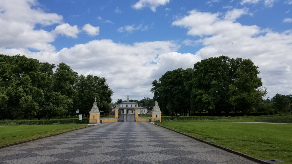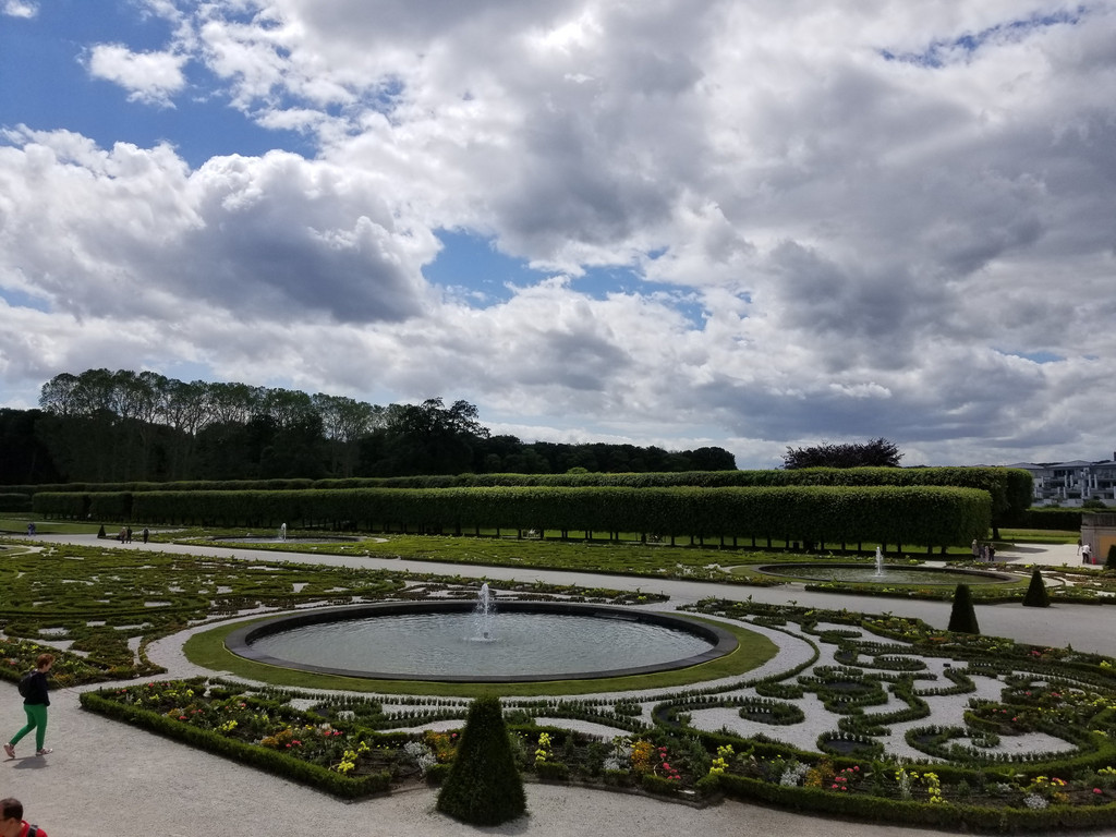 穿过毫不起眼的一个铁门,整座宫殿其实是半开放的,这个门和矮矮的一段围墙完全是摆设,我们有点嘀咕这里真的有大家赞的那么好吗。一条由深灰和浅灰色小方砖拼接成菱形格的道路一直到宫殿门口,两边是绿油油的草坪,很有画面感。进到游客中心正有一群客人准备开始在工作人员的带领下做内部游览参观,我们赶快买票存包,之后开始了一场意想不到的,完全超出期望的奢华洛可可之旅。