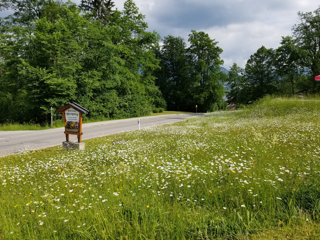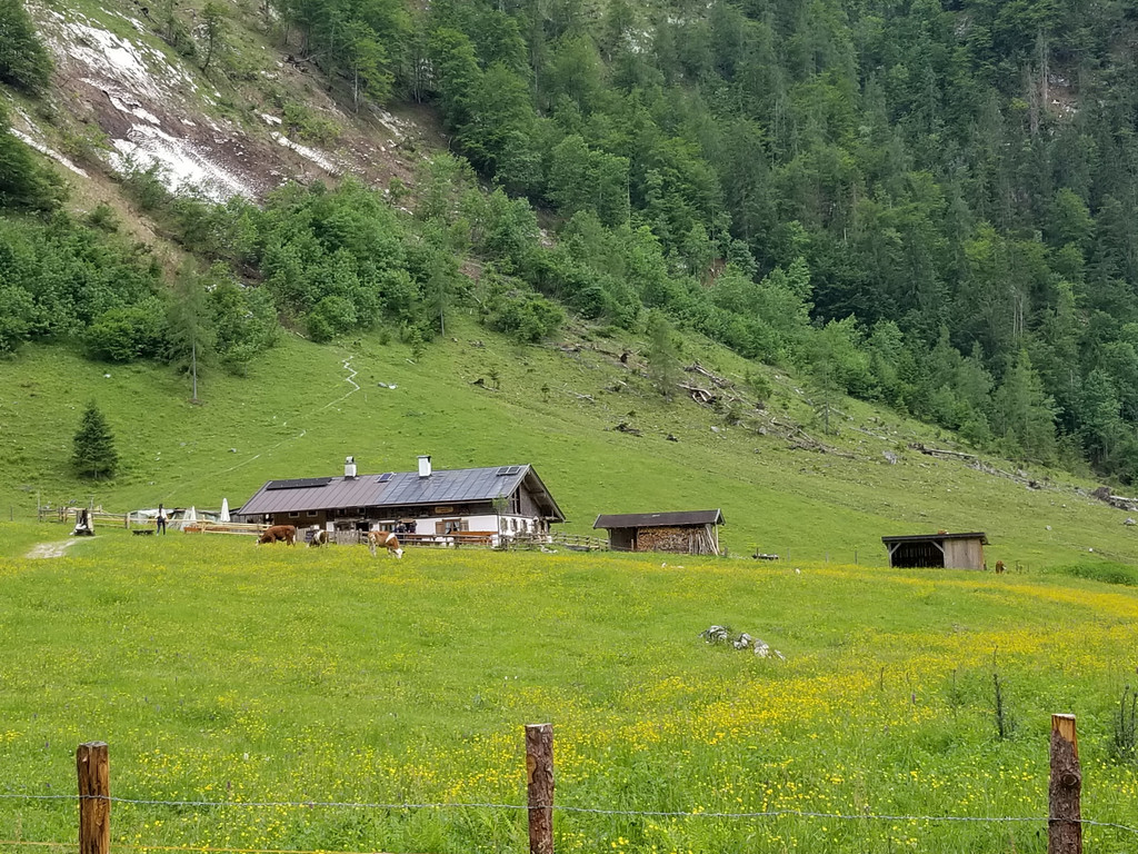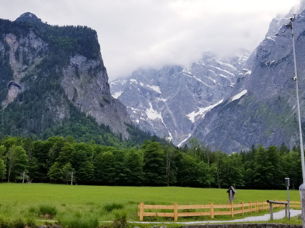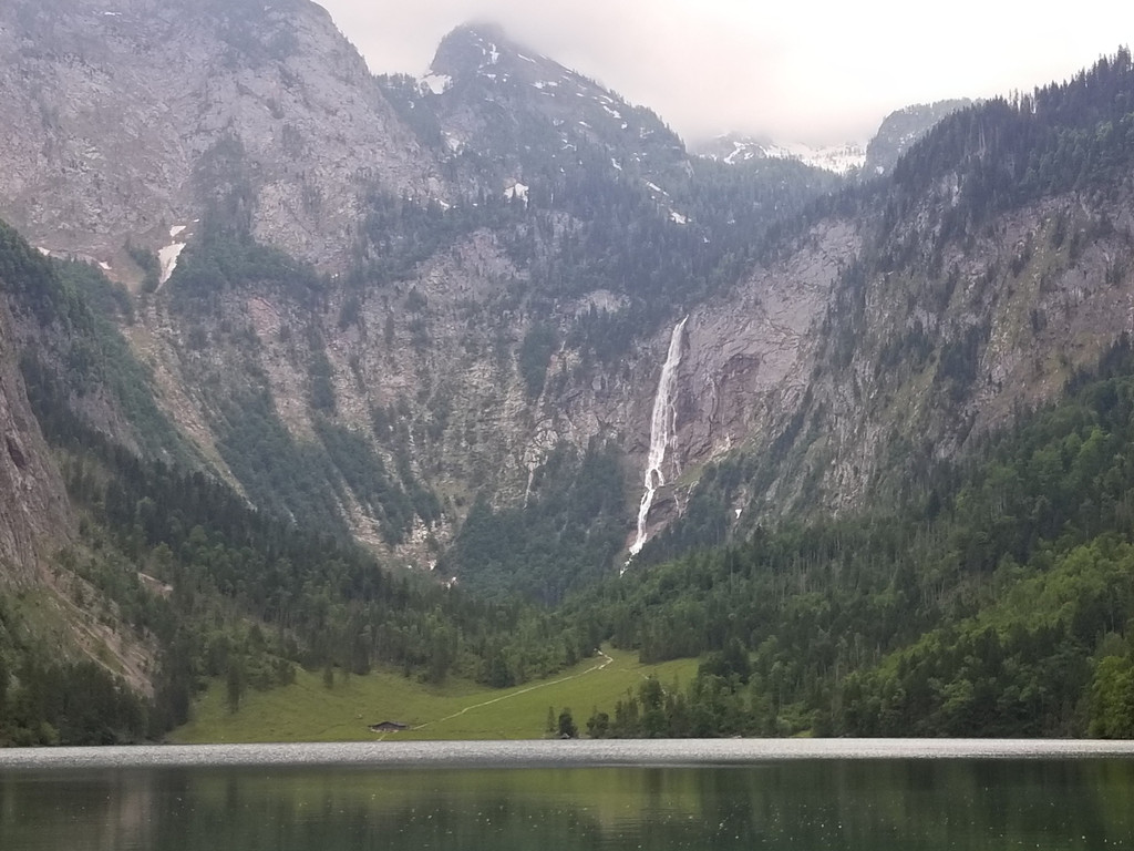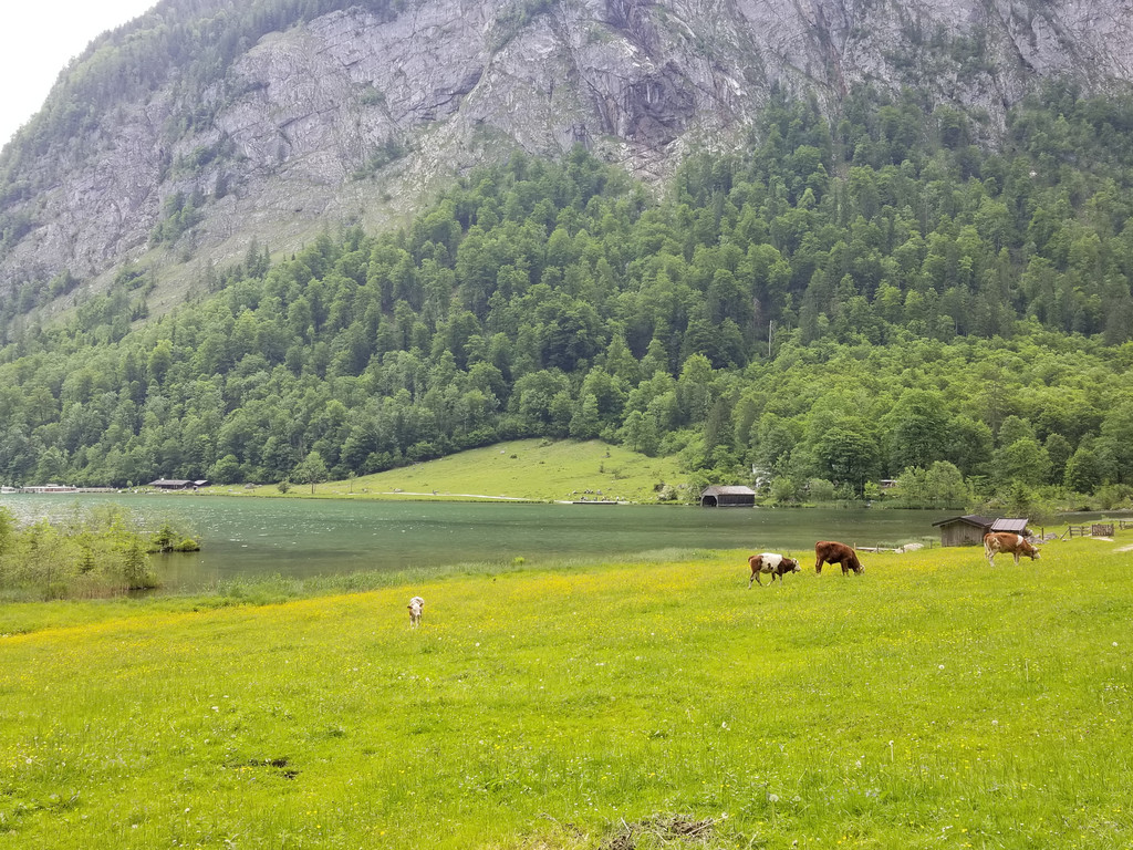 在这样绿悠悠的风景中,国王湖最精华的:上湖obersee到了,据称是德国版的九寨沟,去过九寨沟的我并不太认同,和九寨沟完全不是一个感觉,如果奔着九寨沟的期望值来看一定会失望的。那天没有太阳水面看起来非常普通,湖水一定要艳阳高照才能出彩,就像在加拿大Banff,弓湖Bow Lake在阴天和晴天完全就是天差地别的两幅模样。国王湖整体给人就是一种毫无修饰的天然大气,人与自然的融入感,遥望那条飞流直下的大瀑布,湖边木房子农场悠闲自在的奶牛和满山坡的野花,流淌于岩石间的涓涓小溪,这里是纯净原始的大自然,没有任何人工斧凿的景点,仿佛几百年来都是这个样子的。与九寨沟每个景点之间人头涌动地赶场排队相比,国王湖就是一个可以独享的森林山水,仿佛与世隔绝。