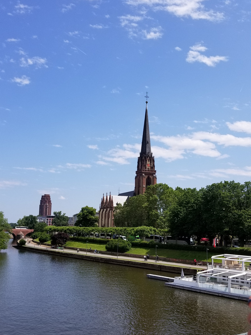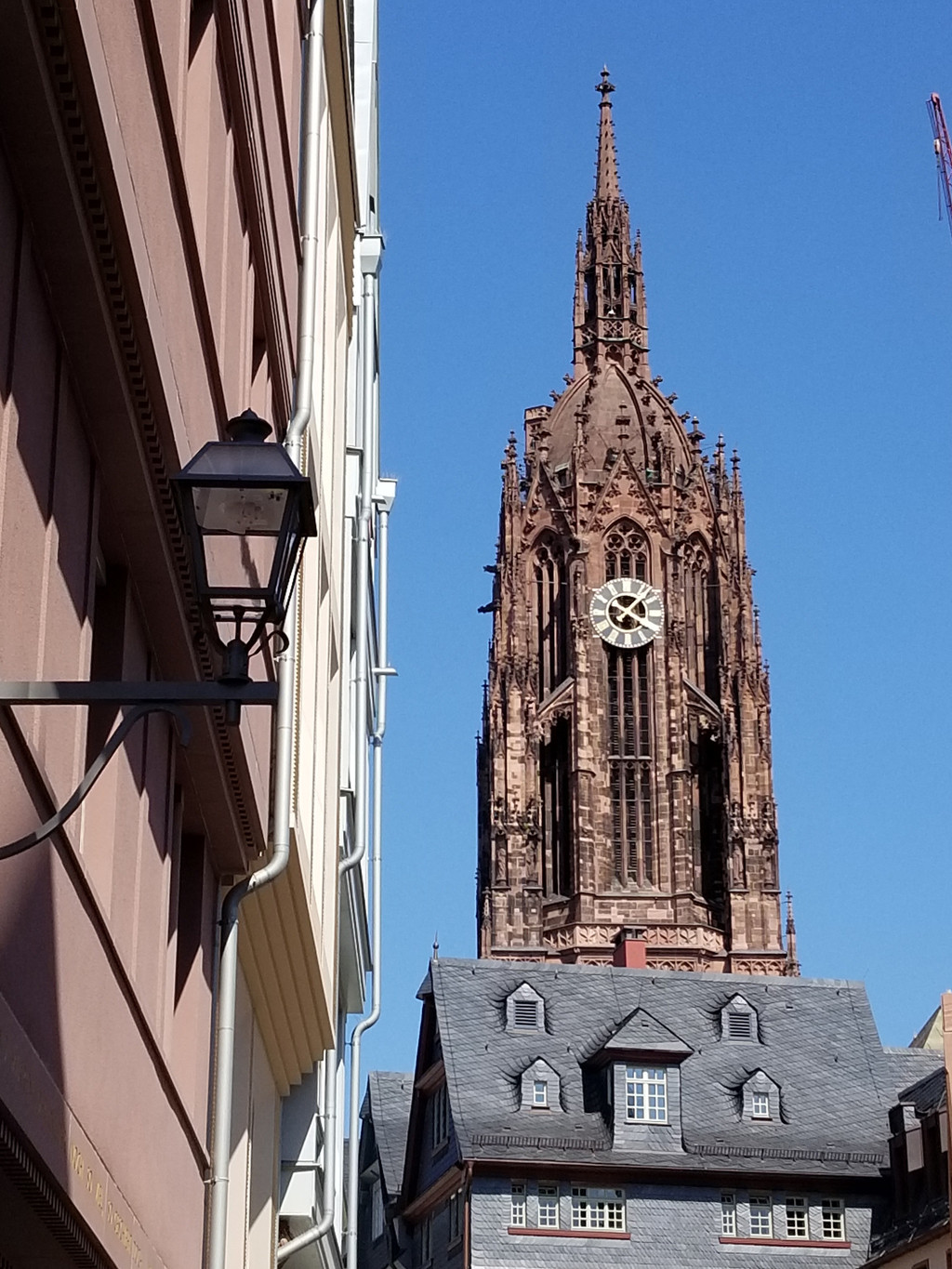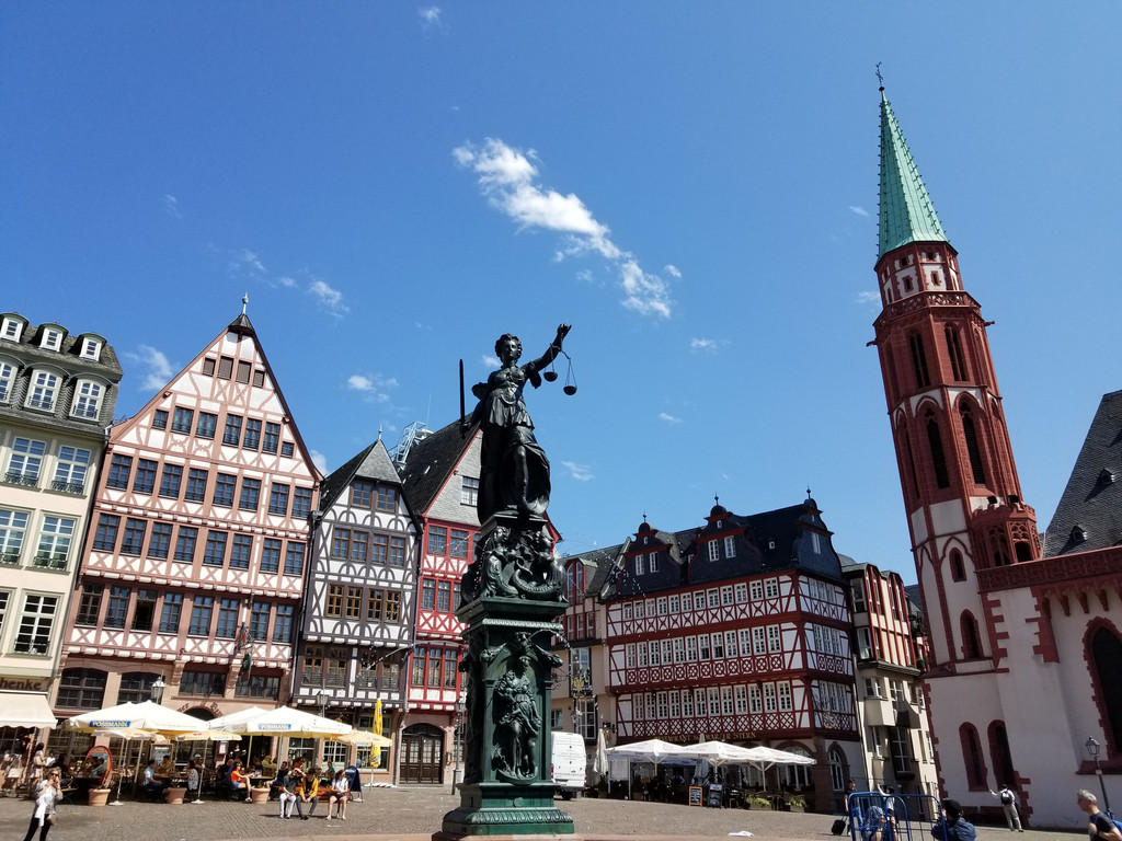 以法兰克福为中心,我们还要去科隆、海德堡,临时增加的布吕尔是意外的惊喜。法兰克福是一个现代化的城市,同时也保留了很多老城的遗迹和韵味两者融汇非常迷人。我们住的酒店位于老城区距离罗马广场、法兰克福大教堂很近,罗马广场修建于中世纪,是保留着中古街道面貌的唯一广场。广场中间是正义女神喷泉,周边是旧市政厅以及法兰克福大教堂为代表的一些古老建筑保留着昔日的风貌,对于经历过战争和英国空军轰炸过的城市来说,曾经举行过十位德国国王的加冕典礼的600年历史的帝国大教堂还能魏巍屹立可以说是奇迹了。
