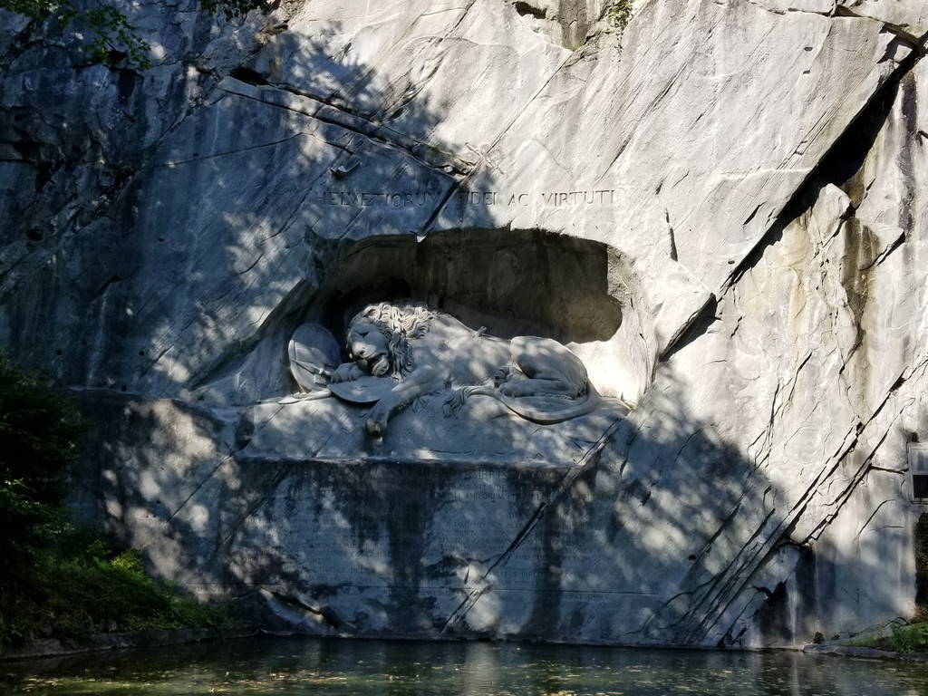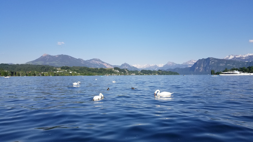 卢塞恩有几个著名景点:始建于1333年的卡佩尔廊桥、冰川公园、濒死的狮子纪念碑是为了纪念保护法国国王路易十六家族的安全,全部战死的786名瑞士雇佣兵。正因为忠勇无双,为梵蒂冈教皇服务的一直都是瑞士卫队。这几个景点挨着都很近,步行走下来最多也就三个小时左右,时间尚早,我们就租了脚踏船往卢塞恩湖里去。湖中心有几只白天鹅,一点也不怕船挨近了都不会躲开,干脆就停下来看这些白天鹅们啄水草玩,远处又是连绵的雪山,微风习习。
