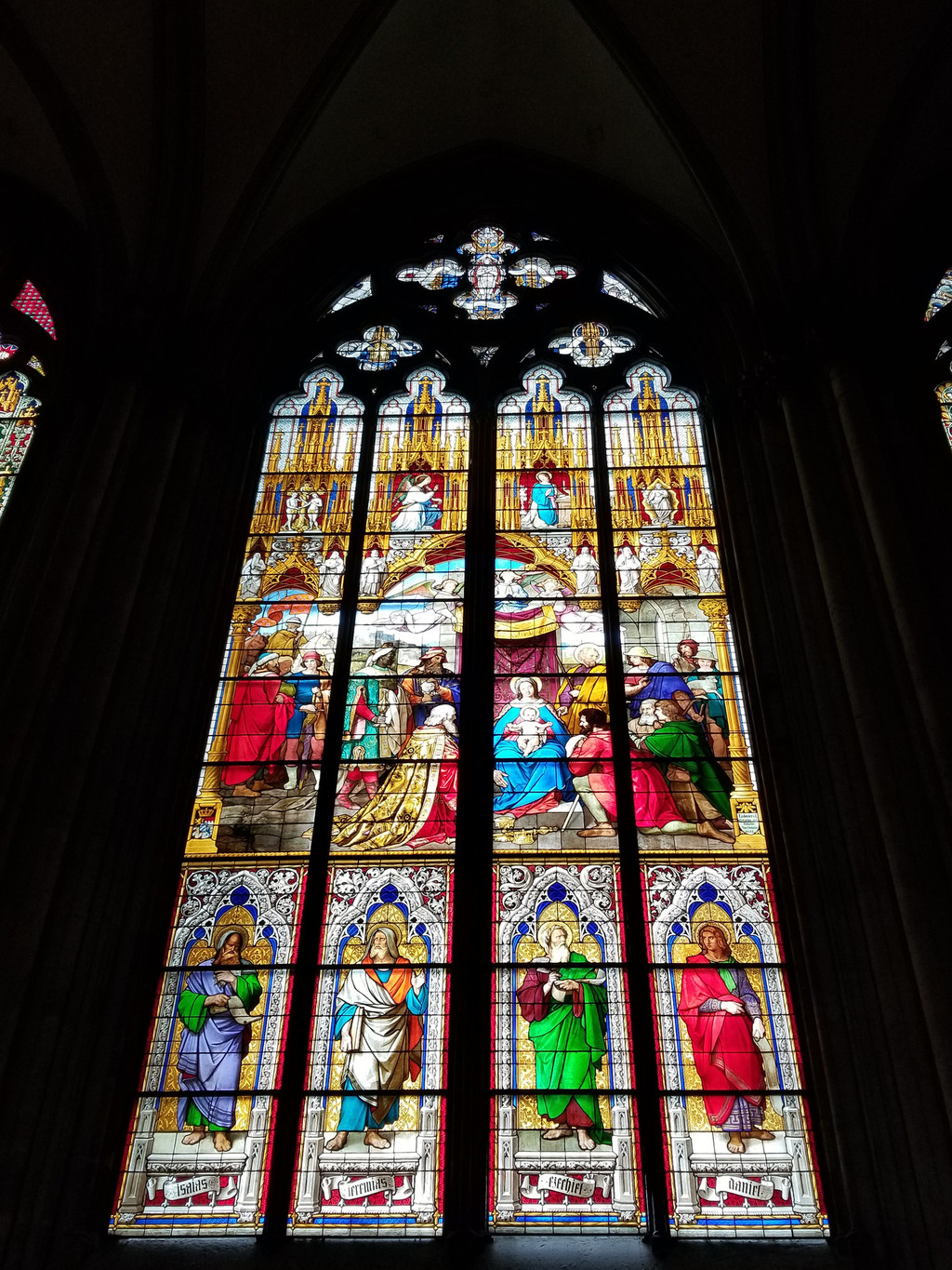 教堂实在是太高太大了,难以拍到全貌,只好围着教堂转了一圈从各个角度取景。随着人群排队进入到教堂,立刻感受到了强大的气场,静谧神圣。描绘圣经人物的彩绘玻璃窗庄严美丽,古老精美的宗教陈设雕像,叹为观止。参观到最后,按惯例女儿又点燃了一只许愿蜡烛。