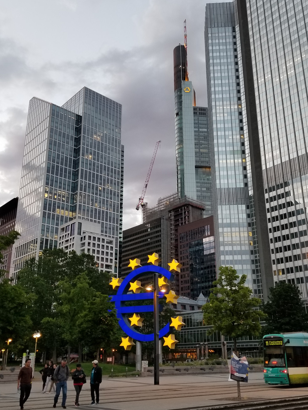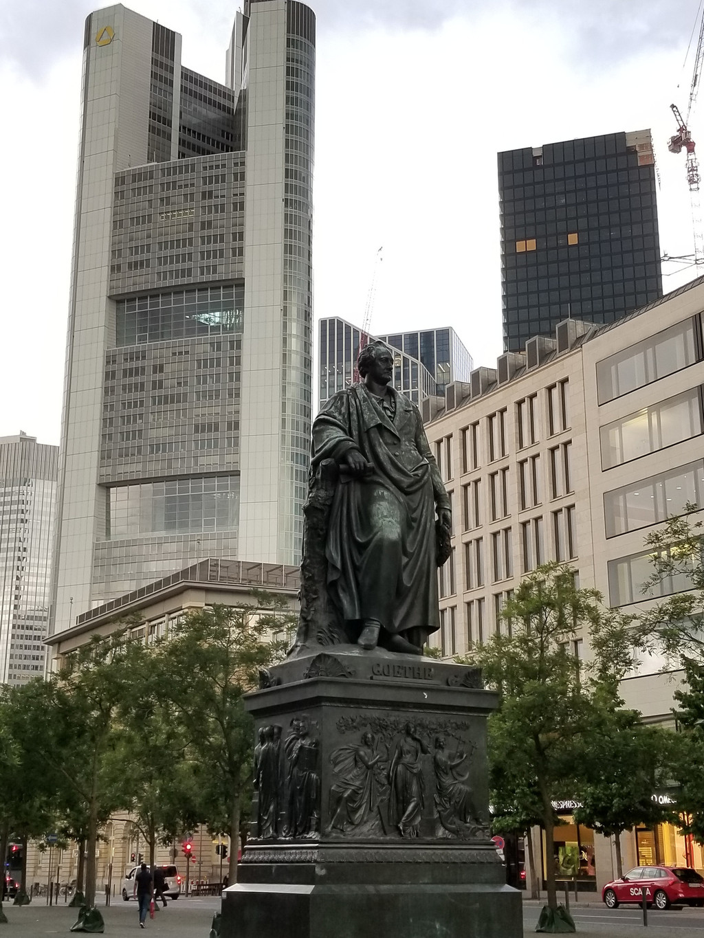 法兰克福的古今合璧在歌德广场体现得非常直接,歌德雕像四周是高楼林立的银行大厦和灯火辉煌的奢侈品商店,在欧洲央行总部前大大的欧元标志在夜晚非常醒目,象征着法兰克福作为欧洲金融中心的地位。