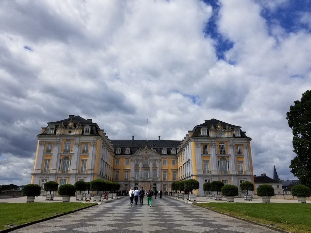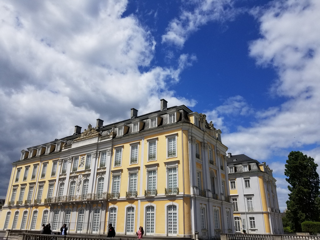 几分钟后我们已经在科隆火车站里面,去布吕尔的那条线路属于城市间的短途铁路,通票不适用。在车站工作人员的帮助下在自助机器上买好了火车票,时间卡的刚刚好。上车,下车,出站,然后我们就呆住了!火车站正对面也就50米一座淡黄色的建筑,就是我们的目的地:布吕尔 Augustusburg Palace奥古斯堡宫