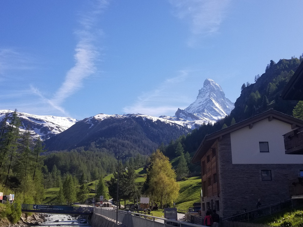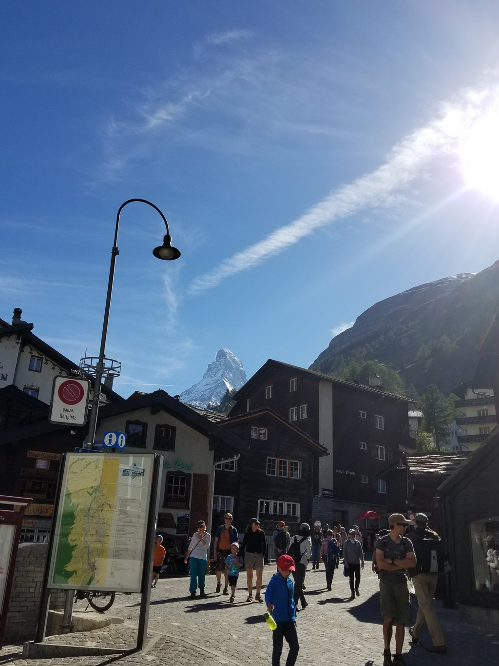 经过3小时40分钟,终于到达了采尔马特小镇,小镇上禁止汽车进入,只有电瓶车,火车站就在小镇里拖着箱子在石板路上走上5分钟到了酒店,工作人员非常热情亲切,放好了行李没感觉到疲惫兴奋得跑出门闲逛。