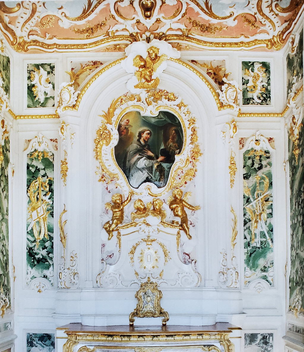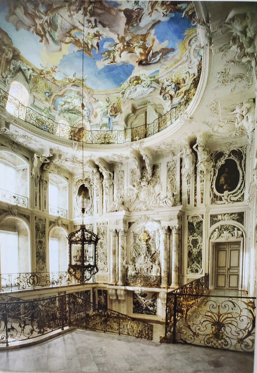 首先,了解一下这座宫殿的历史,建造它的主人是科隆选帝侯、大主教克莱门斯 奥古斯特(1700-1761),他是当时神圣罗马帝国皇帝查理七世的弟弟。无数欧洲著名的杰出艺术家为它的美丽奢华做出了贡献,当然也是花费了巨资的,其中大部分来自查理七世,正是这位皇帝对弟弟的慷慨资助成就了今天我们看到的这个无比奢华的洛可可宫殿,修建宫殿时的原材料据说都是当年最顶级、稀有的。令人惊叹的、眼花缭乱的各种艺术装饰品、雕刻、绘画、家具器皿,不夸张的说凡尔赛宫与其相比都黯然失色。整个参观过程不允许拍照,只好买了明信片以作留念,下面的两张内部图片均是明信片翻拍。具有鲜明的法国风尚的奥古斯堡庭院据说是由凡尔赛宫园艺师的学生所设计。奥古斯堡宫从1949年开始被当年的联邦德国政府和总统作为招待国宾的迎宾楼,1984年被联合国教科文组织列入世界遗产名录。
