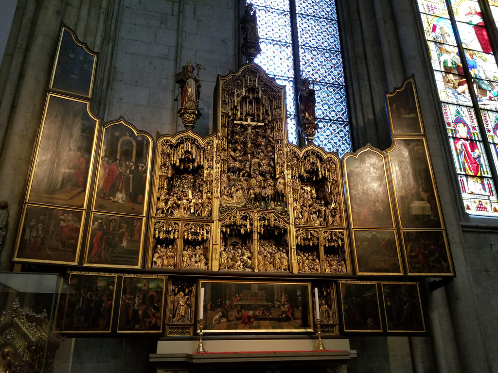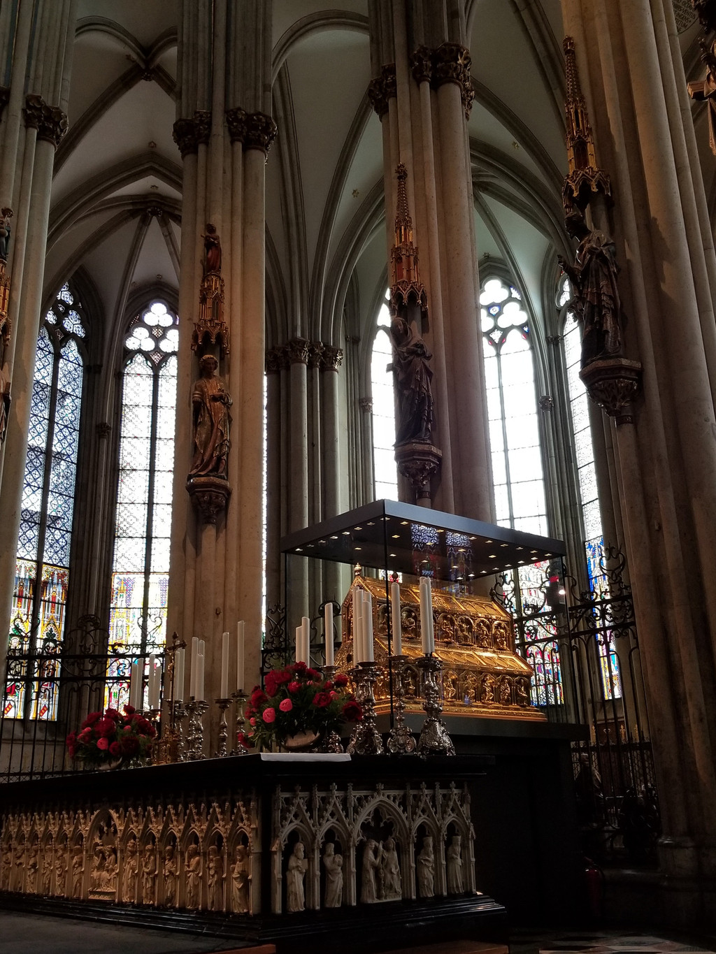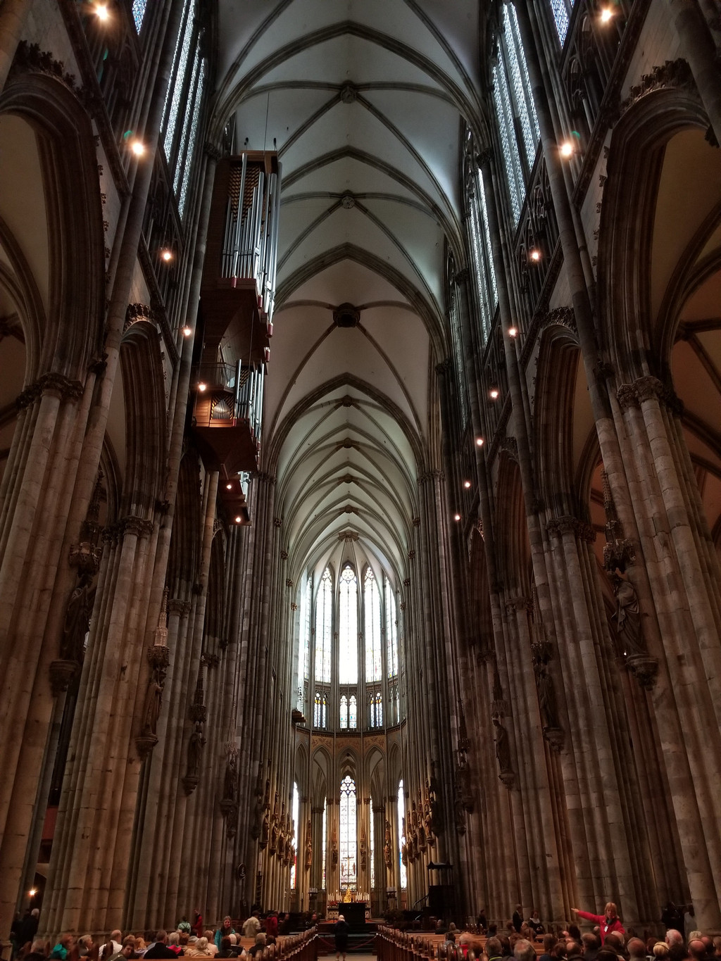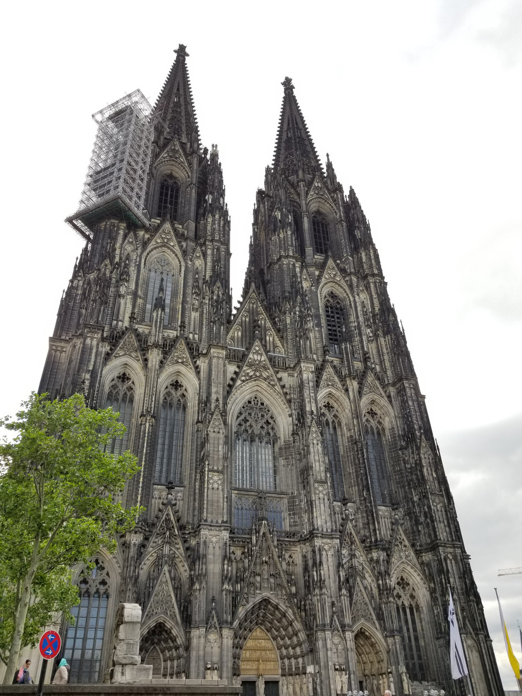 去科隆及海德堡还是乘坐欧铁,通票还有两天没有用,6月7号我们先去了慕名已久的科隆,图片上看到很多很多次的科隆大教堂终于就要站在它的脚下了,不曾想天公不作美是个大阴天,法兰克福到科隆一个小时多一点,盼着到了科隆天气能转好,结果还是阴云密布冷风阵阵,6月里竟然冻得我们是瑟瑟发抖。出了科隆火车站一抬头一座巨大的青黑色哥特式大尖顶教堂——仰慕已久的科隆大教堂竟然就在火车站外的广场上,突兀的让我都来不及调整到虔诚觐见的状态。欧洲三座最伟大的教堂已见其二,女儿遍历欧洲各国去过各个著名教堂,最为推崇罗马的圣彼得大教堂,但是站在科隆大教堂前依然感到强大的威严与震撼。时至今日这座教堂依然是世界上最高的双塔教堂,黑色的石头清奇冷峻充满力量,跨越了六个多世纪始建于1248年,先后的建筑者都持有相同的信仰,绝对忠诚于原定计划,成就了建筑史上无与伦比的旷世杰作。