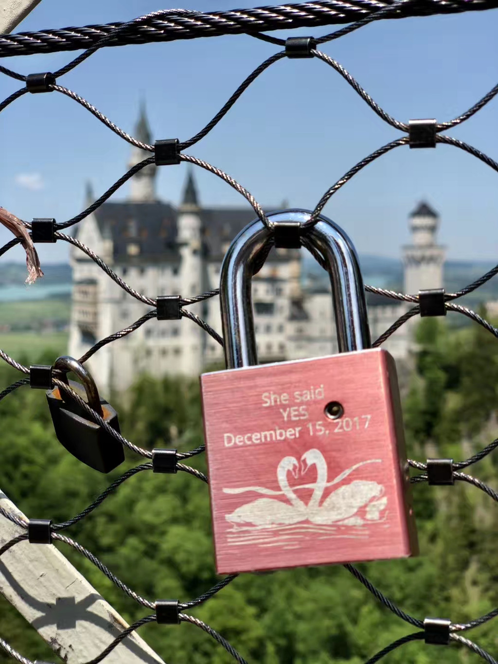 进入天鹅堡参观的过程和感受网上有太多的介绍、图片和游记,此处省去几百字不啰嗦,重点是参观完之后我俩在里面的礼品店逗留了很久,很多东西都想买,无奈真的不便宜,最后取舍半天买了一些手工皂、天鹅造型的首饰盒和印有天鹅堡的杯子以及明信片冰箱贴。路德维希和姑姑茜茜公主感情很好,城堡里茜茜公主的纪念品也不少。欣赏新天鹅堡全貌的最佳地点就是玛丽安桥,蓝天白云下新天鹅堡真的是太美了,无论看过多少图片当身临其境还是会深深地感叹!一些游客就静静地站在那里看许久并不忙着像我们一通狂拍。玛丽安桥高高地悬在山谷之间往下看有点眼晕,桥上挂着许多各式各样的锁,这在后面的德国行程里多次出现,只要是桥就挂满了锁。
