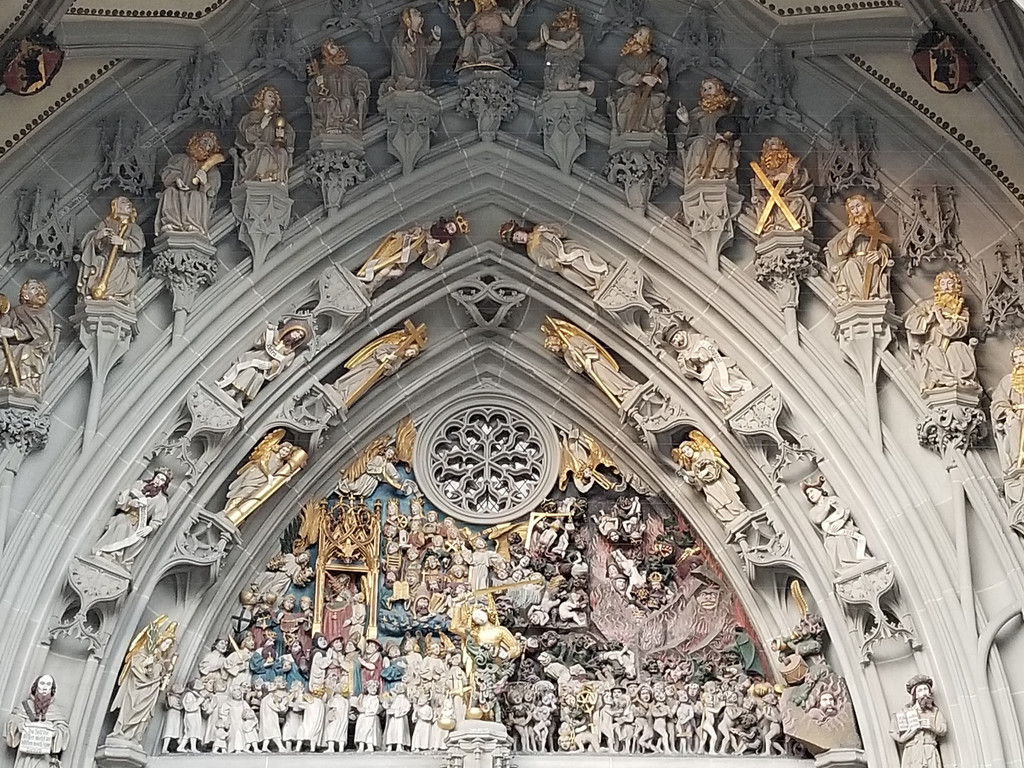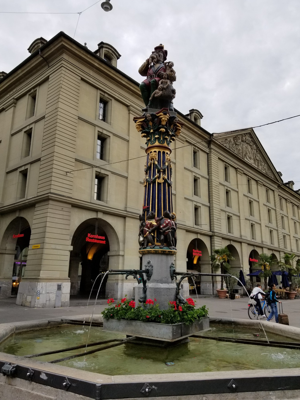 伯尔尼古城的钟楼是1530年完成的,这不仅是一座时钟,除了显示日期、时间还有日、月、星球的位置,不愧是闻名世界的钟表王国。在古城走不远就能看到街心喷泉,喷泉顶端的雕塑各有不同,一共是11座,而泉水据说是从阿尔卑斯山上引来的可以直接饮用。我们只匆匆看了几个,其中有个吃小孩的雕塑还挺吓人。