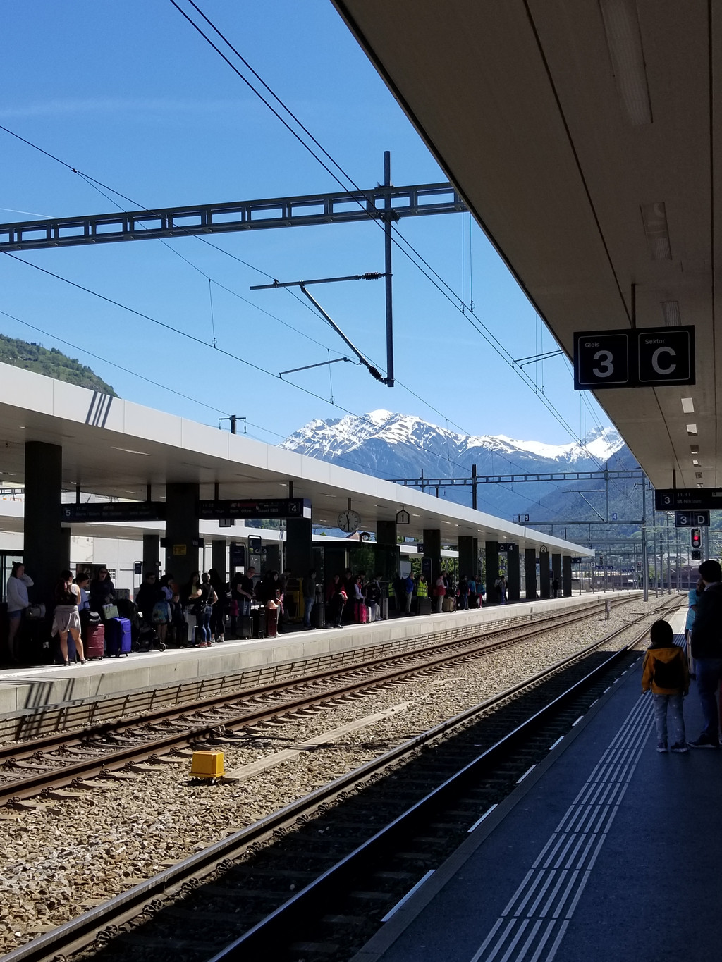 日内瓦走马观花后第二天坐火车到采尔马特,著名的马特洪峰山脚下的小镇,车次是提前在一个欧铁的APP上查好了的,酒店吃完早餐退了房拉着箱子3分钟就走到了GENEVE CFF车站在站台上候车,非常便捷,虽然中间在VISP换乘APP上的信息非常清楚,很容易找到下一班火车的站台。上了火车只要是没有显示被预订的座位(座位号是电子的)就可以像坐地铁一样,一般情况不需要提前预订座位,但如果是在旅游旺季或是热门车次还是预订为好。