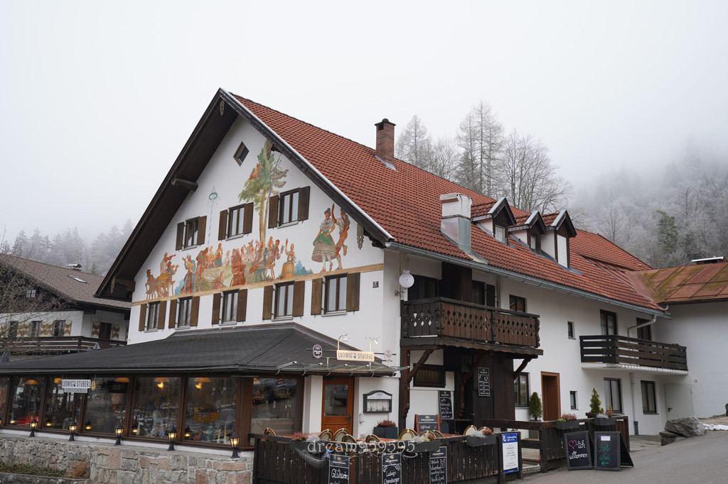 新天鹅堡山下的餐厅, 餐厅外墙的彩绘好看,环境也不错。从新天鹅堡下来等车或休息的估计都会来坐坐吧。餐厅客人总是满满的。
