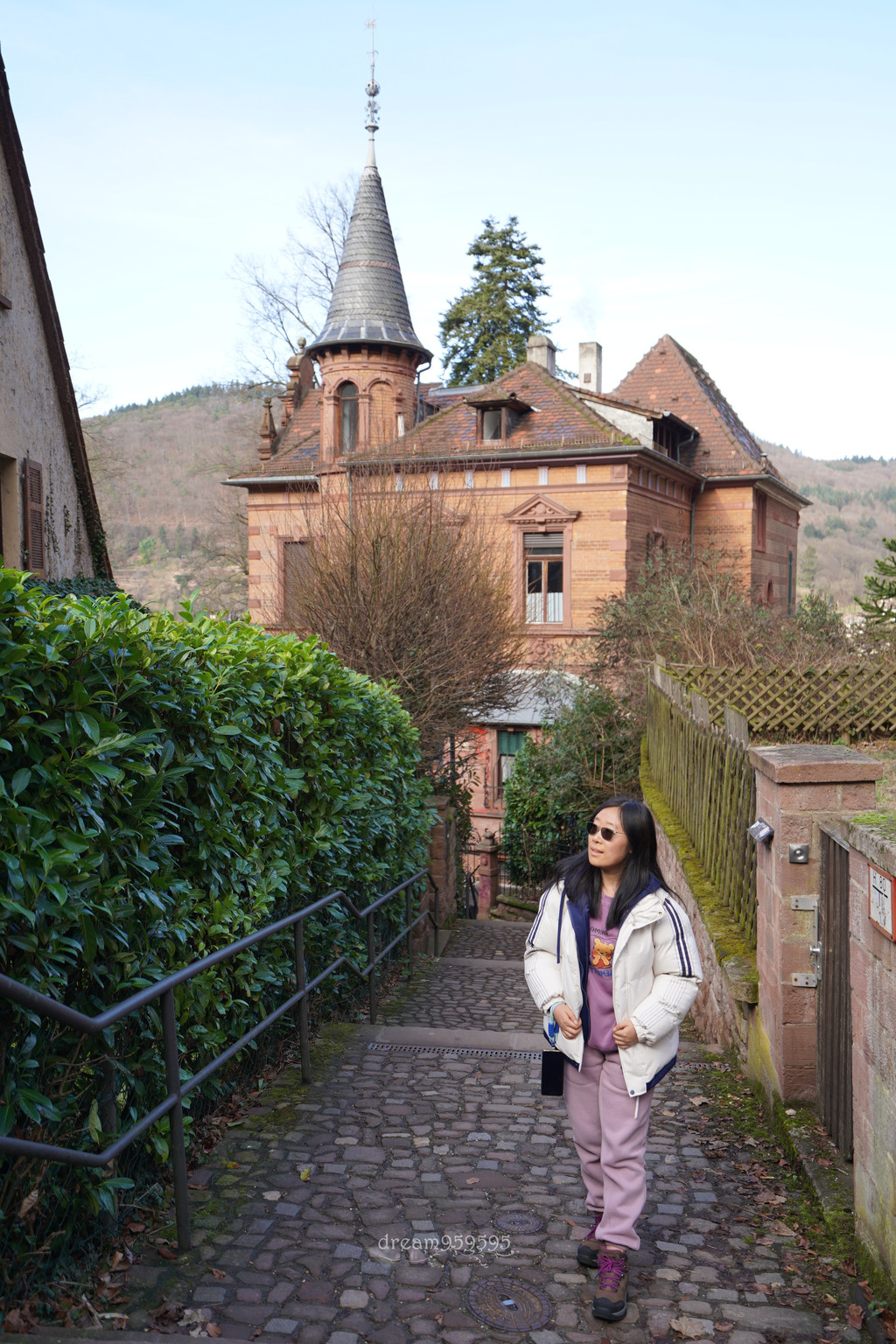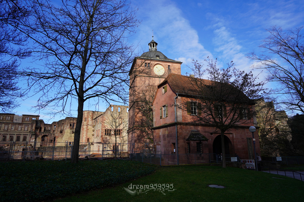 城堡在山上,爬上去十分钟,有两条路,选了阶梯的。城堡外面可以观海德堡全景。